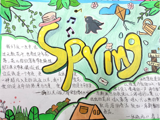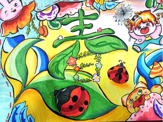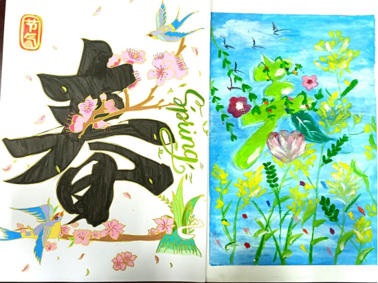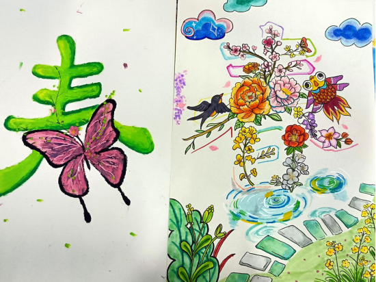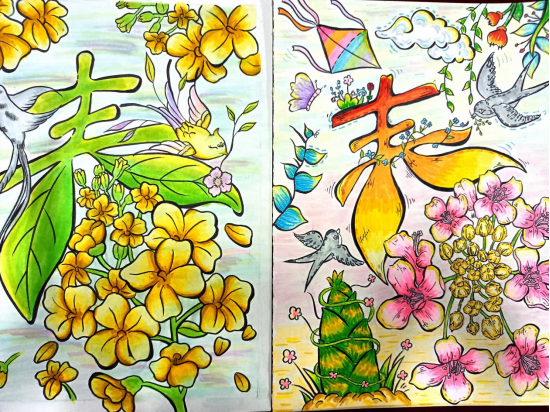 “一笔春色”活动要求同学们以“春”字为创作核心,可以利用春天的各种花草植物进行艺术创作,且作品要有原创行、内容积极向上。从收集到的作品看,同学们在创作中构思巧妙、创意新颖,他们或将“春”字笔画化作柳枝、桃花、飞燕等春日意象;或以渐变撞色铺陈底色,让“春”字与繁花、绿草共生,尽显色彩层次;或将学子的青春情怀融入字间,点缀风筝、萌趣图案,传递青春气息;还有一部分作品还采用了环保材料创作,传达了环保、绿色的理念,贴合了“春”字的主题与教育情怀。