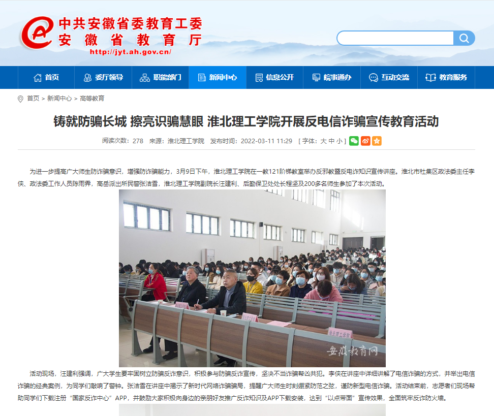 为进一步提高广大师生防诈骗意识,增强防诈骗能力,3月9日下午,Beat365唯一官方网站在一教121阶梯教室举办反邪教暨反电诈知识宣传讲座。安徽教育网首页对此进行了报道。