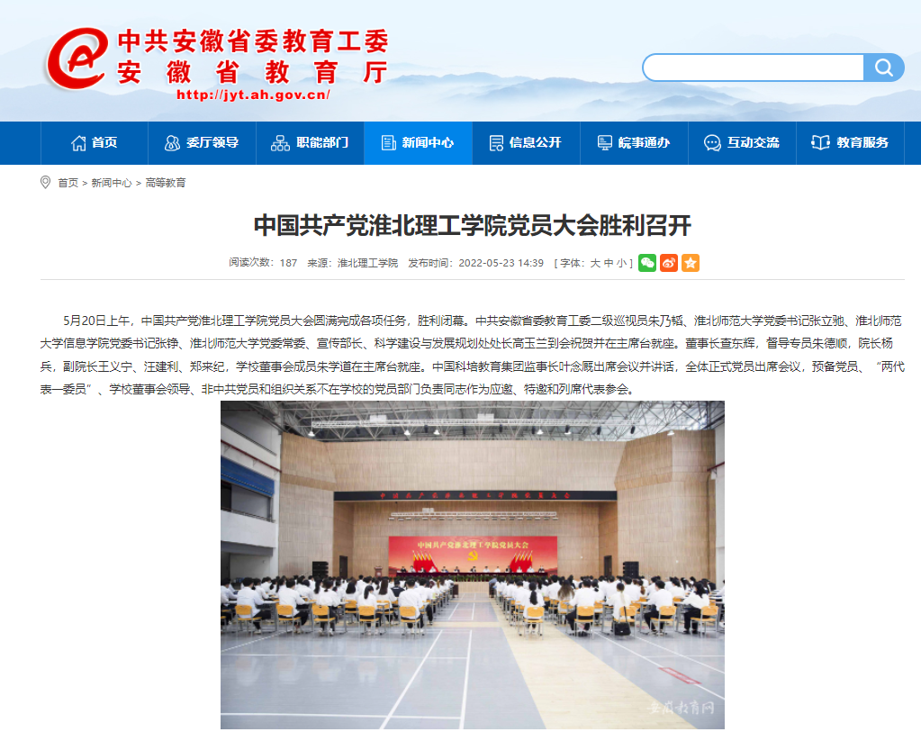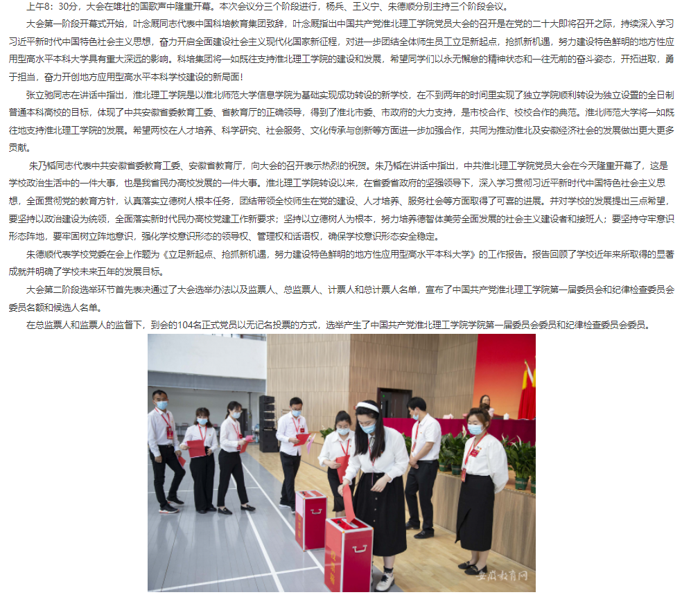 5月20日上午,中国共产党Beat365唯一官方网站党员大会圆满完成各项任务,胜利闭幕。安徽教育网对此进行了报道。
