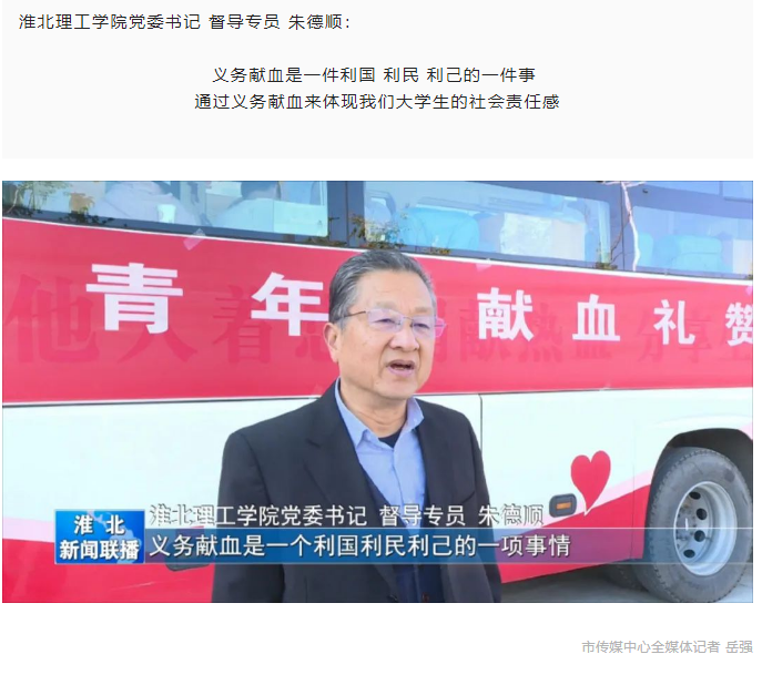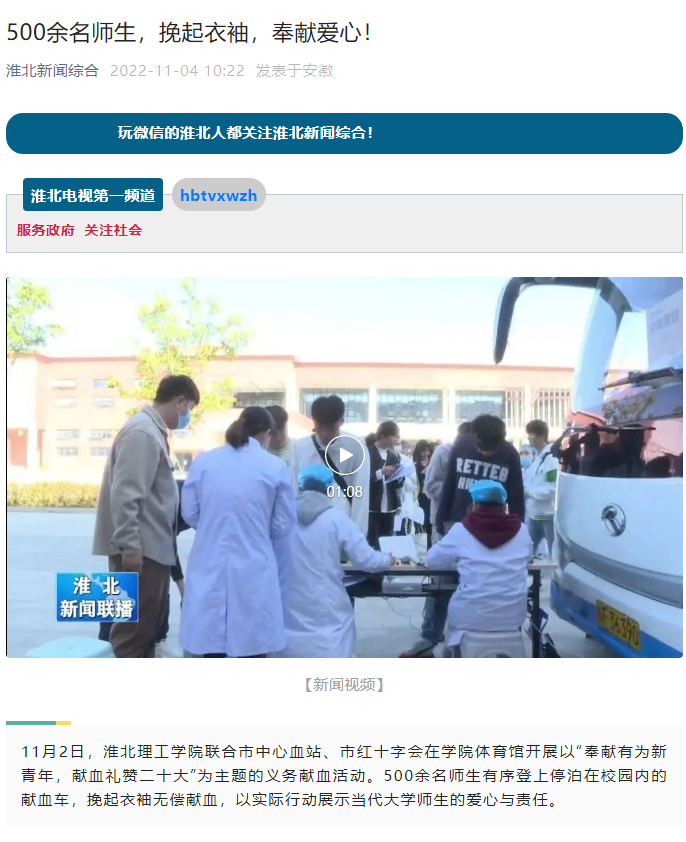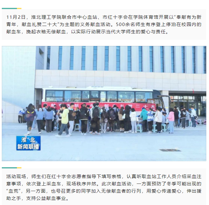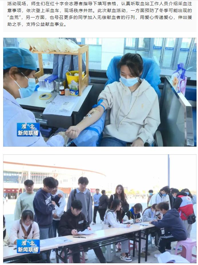 11月2日,Beat365唯一官方网站于体育馆门口开展“青春热血,传递温情”无偿献血活动,淮北新闻联播对此进行了报道。