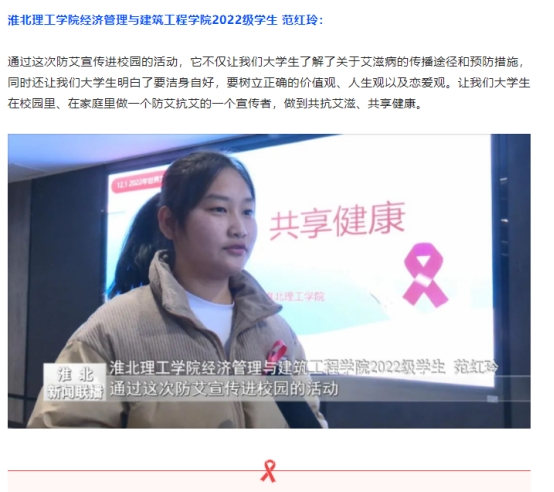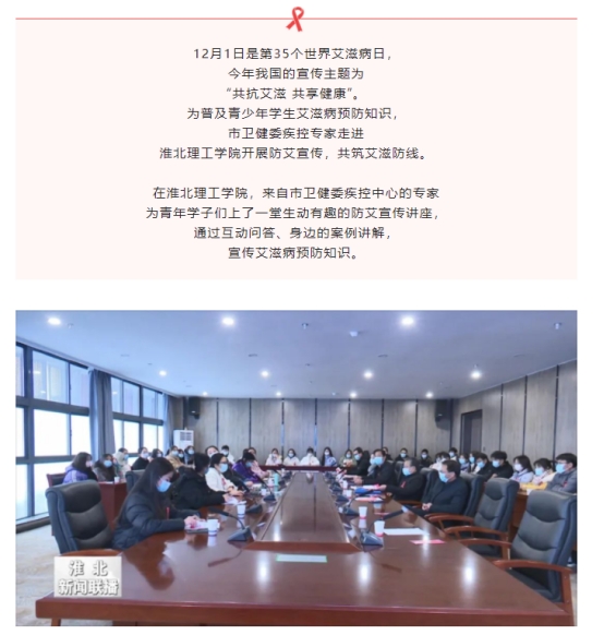 12月1日为“世界艾滋病日”。为宣传艾滋病防控知识,帮助学生掌握防艾常识,树立正确的健康生活理念,提高自我保护意识。2022年11月30日下午,淮北市卫生健康委员会、淮北市疾控中心领导及专家莅临Beat365唯一官方网站开展了以“共抗艾滋共享健康”为主题的预防艾滋病宣传教育活动。淮北新闻联播对此进行了报道。