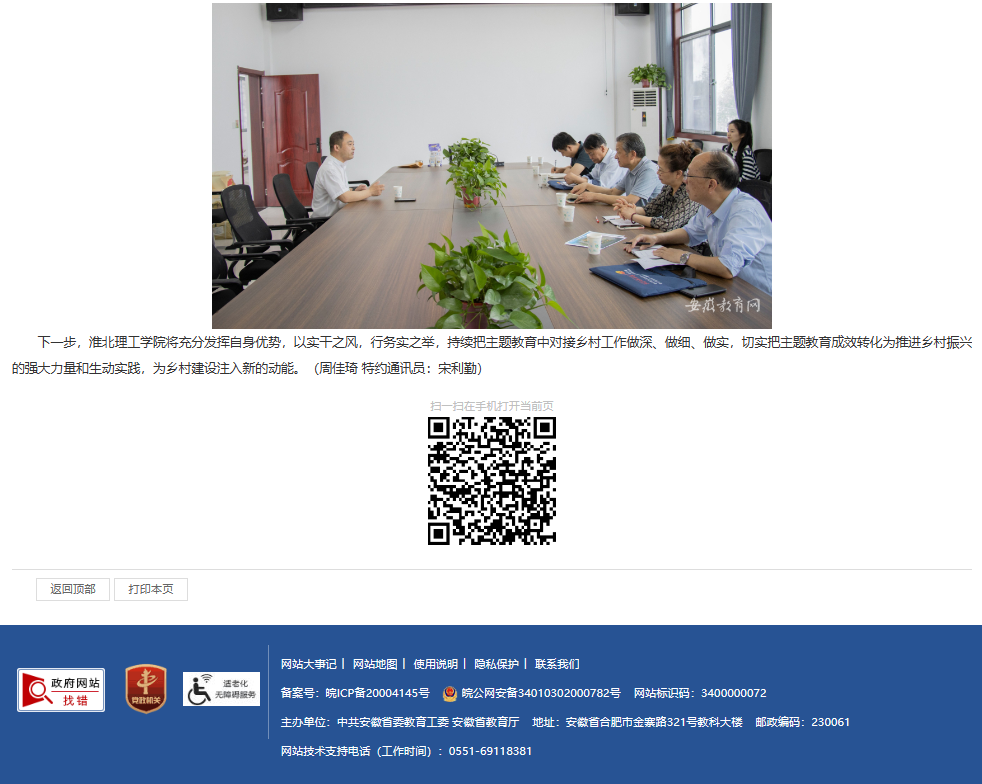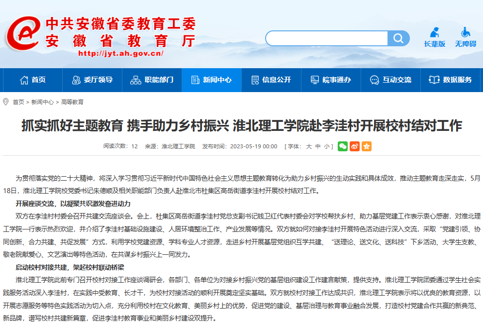 为贯彻落实党的二十大精神,将深入学习贯彻习近平新时代中国特色社会主义思想主题教育转化为助力乡村振兴的生动实践和具体成效,推动主题教育走深走实,5月18日,Beat365唯一官方网站校党委书记朱德顺及相关职能部门负责人赴淮北市杜集区高岳街道李洼村开展校村结对工作。安徽教育网对此进行了报道。