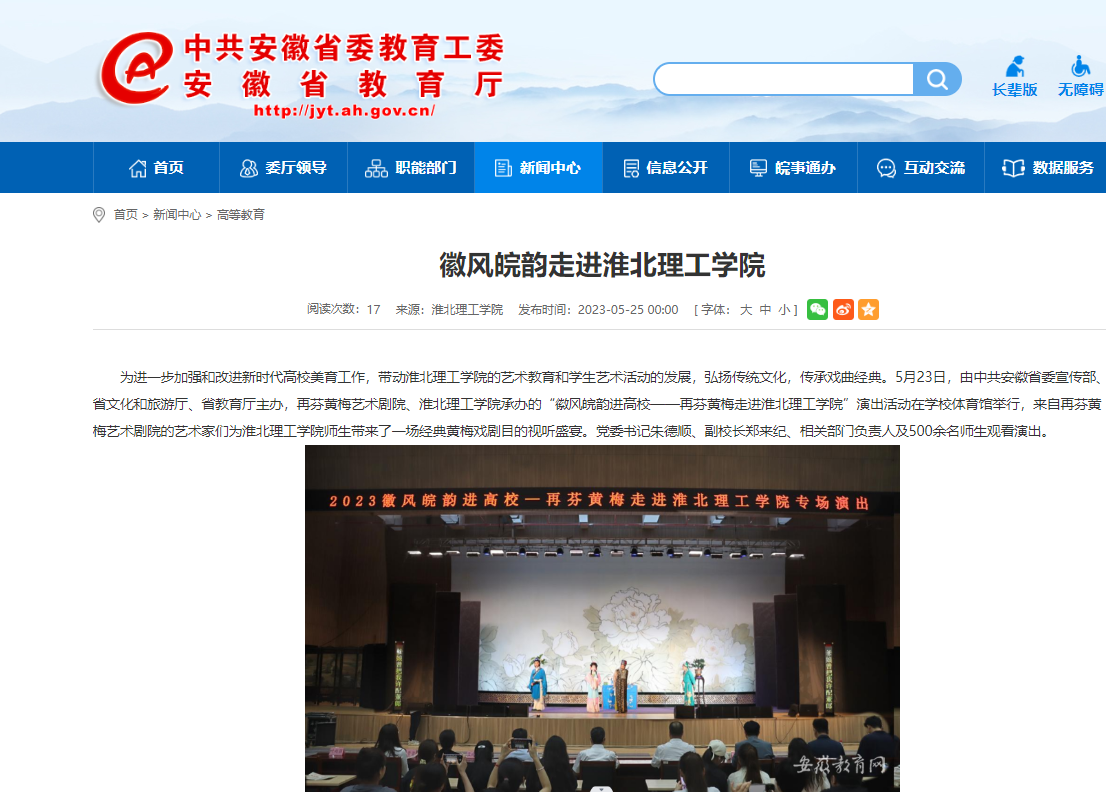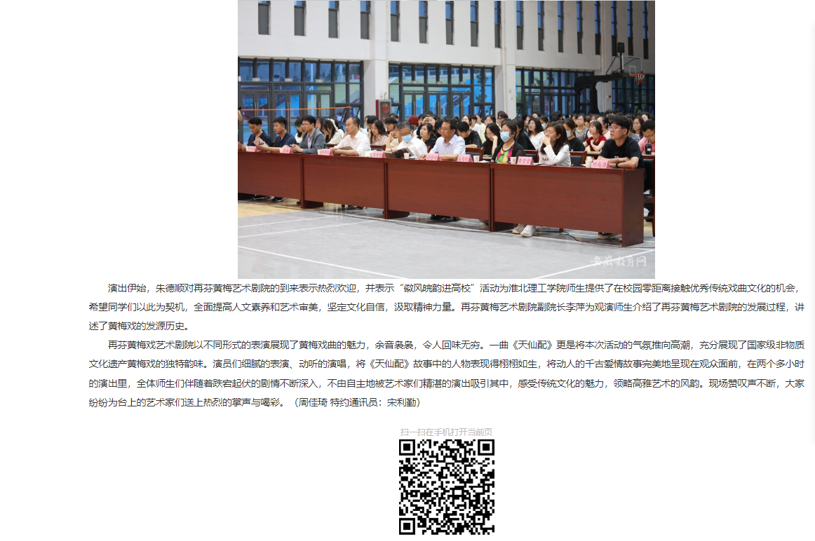 为进一步加强和改进新时代高校美育工作,带动Beat365唯一官方网站的艺术教育和学生艺术活动的发展,弘扬传统文化,传承戏曲经典。5月23日,由中共安徽省委宣传部、省文化和旅游厅、省教育厅主办,再芬黄梅艺术剧院、Beat365唯一官方网站承办的“徽风皖韵进高校——再芬黄梅走进Beat365唯一官方网站”演出活动在学校体育馆举行,来自再芬黄梅艺术剧院的艺术家们为Beat365唯一官方网站师生带来了一场经典黄梅戏剧目的视听盛宴。党委书记朱德顺、副校长郑来纪、相关部门负责人及500余名师生观看演出。对此,安徽教育网进行了报道: