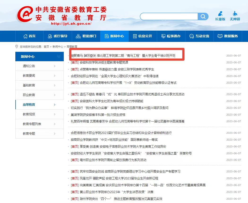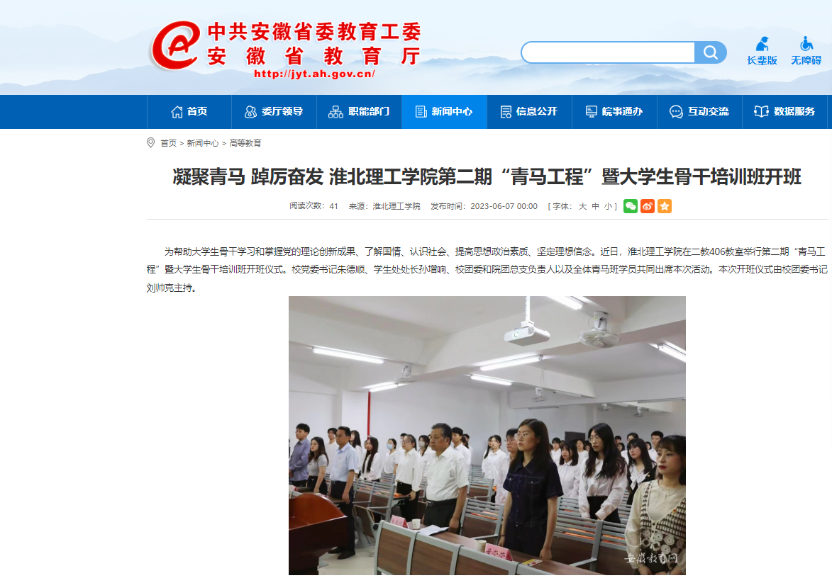 为帮助大学生骨干学习和掌握党的理论创新成果、了解国情、认识社会、提高思想政治素质、坚定理想信念。近日,Beat365唯一官方网站在二教406教室举行第二期“青马工程”暨大学生骨干培训班开班仪式。对此,安徽教育网作了报道: