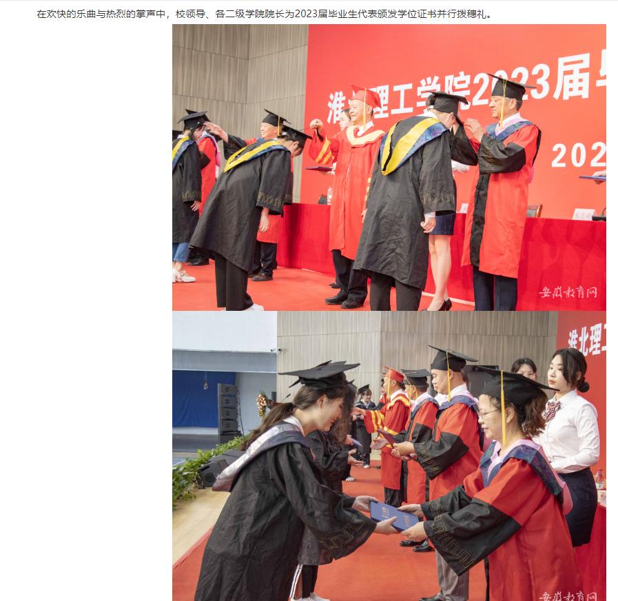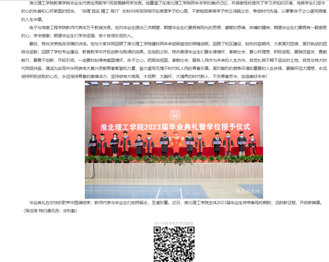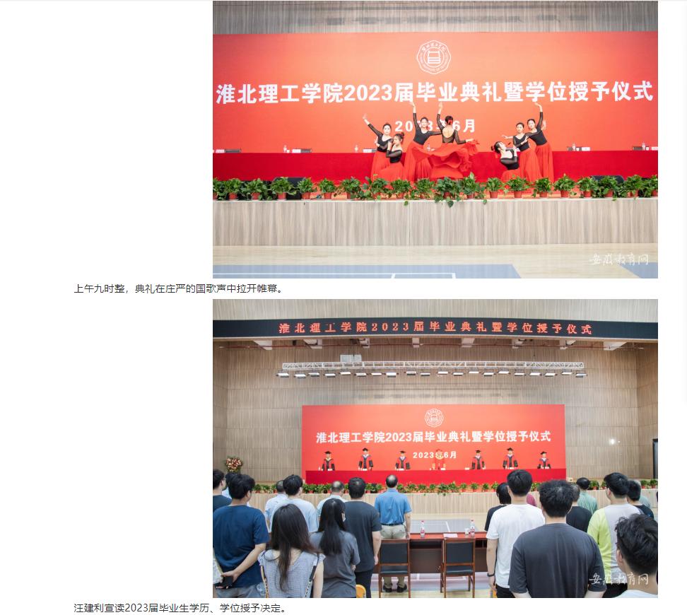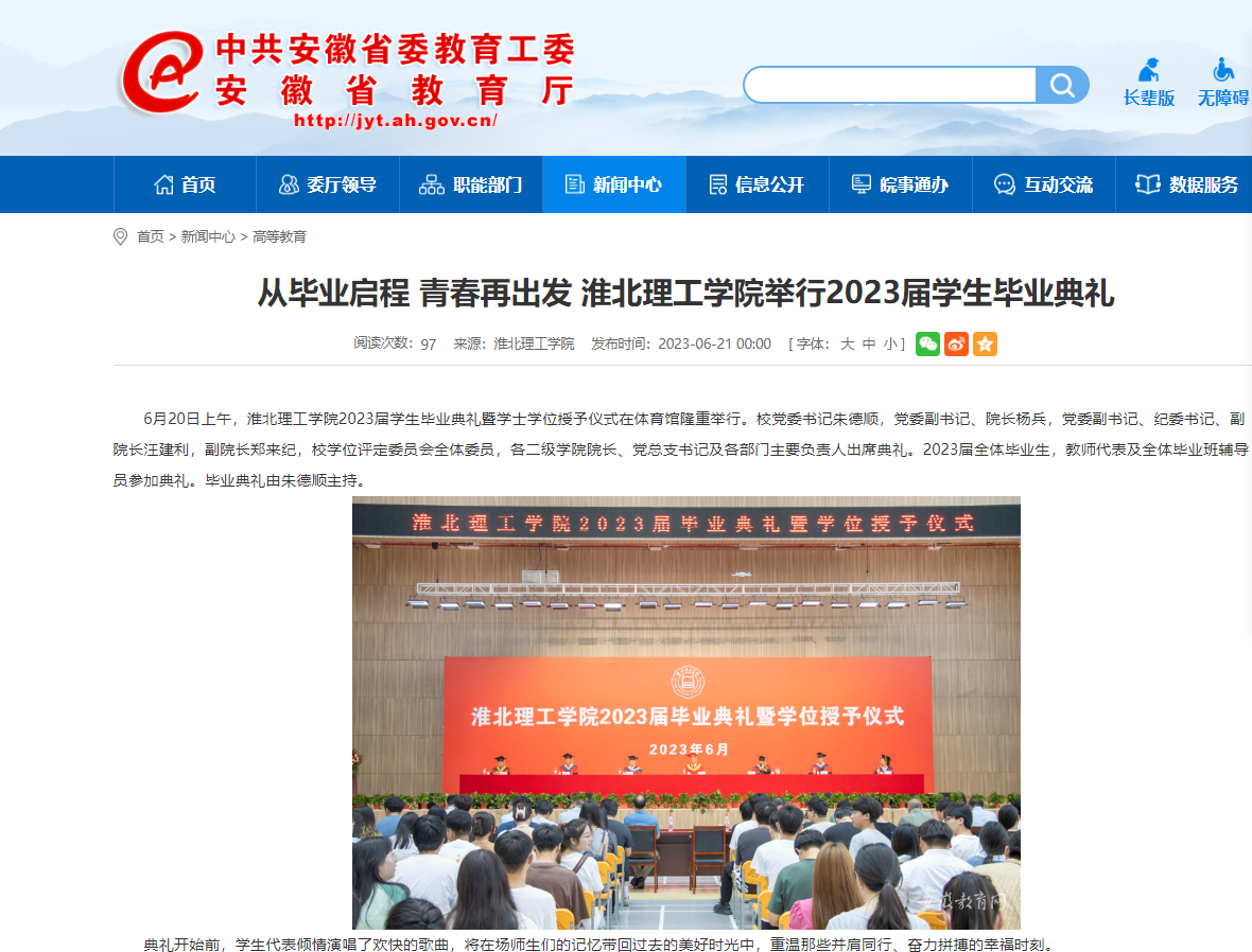6月20日上午,Beat365唯一官方网站2023届学生毕业典礼暨学士学位授予仪式在体育馆隆重举行。校党委书记朱德顺,党委副书记、院长杨兵,党委副书记、纪委书记、副院长汪建利,副院长郑来纪,校学位评定委员会全体委员,各二级学院院长、党总支书记及各部门主要负责人出席典礼。2023届全体毕业生,教师代表及全体毕业班辅导员参加典礼。毕业典礼由朱德顺主持。对此,安徽教育网作了报道: