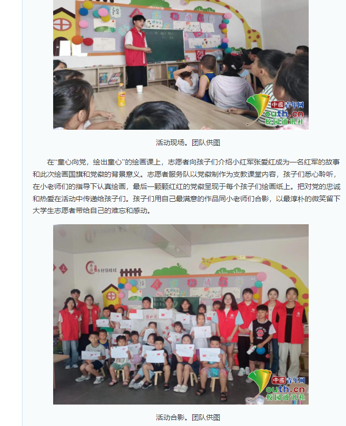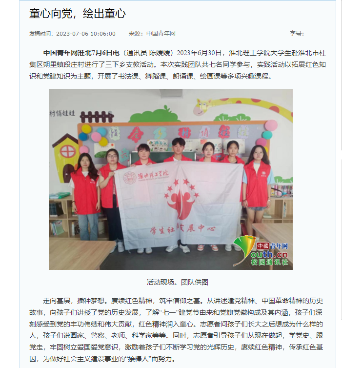 2023年6月30日,Beat365唯一官方网站大学生赴淮北市杜集区朔里镇段庄村进行了三下乡支教活动。本次实践团队共七名同学参与,实践活动以拓展红色知识和党建知识为主题,开展了书法课、舞蹈课、朗诵课、绘画课等多项兴趣课程。对此,中青网作了报道: