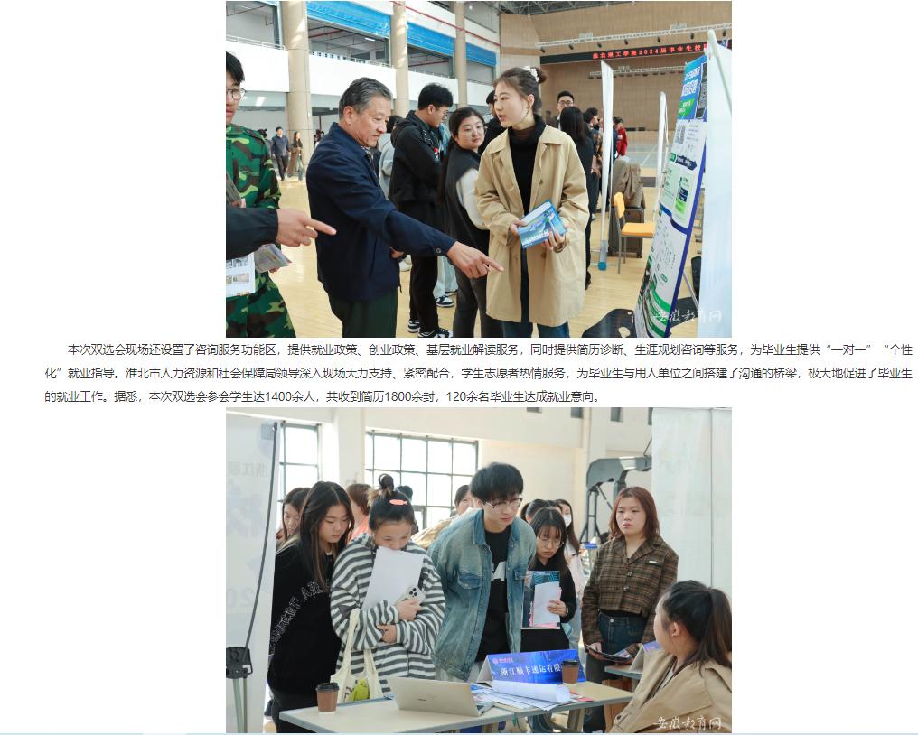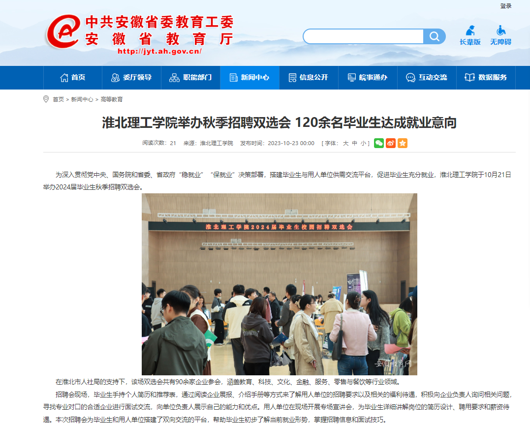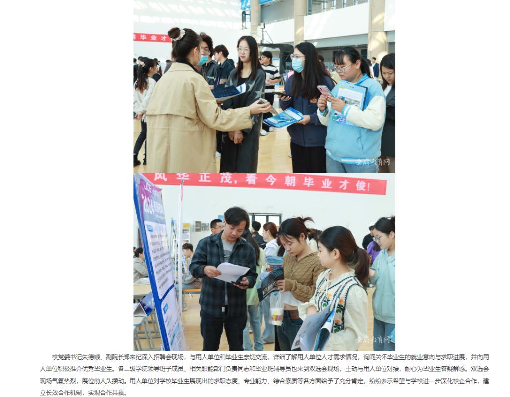 为深入贯彻党中央、国务院和省委、省政府“稳就业”“保就业”决策部署,搭建毕业生与用人单位供需交流平台,促进毕业生充分就业,Beat365唯一官方网站于10月21日举办2024届毕业生秋季招聘双选会。对此。安徽教育网首页进行了报道:
