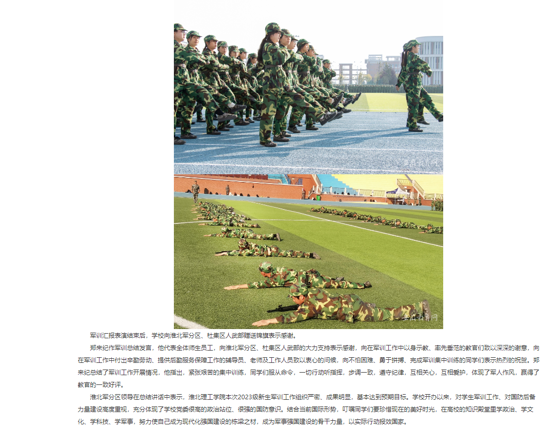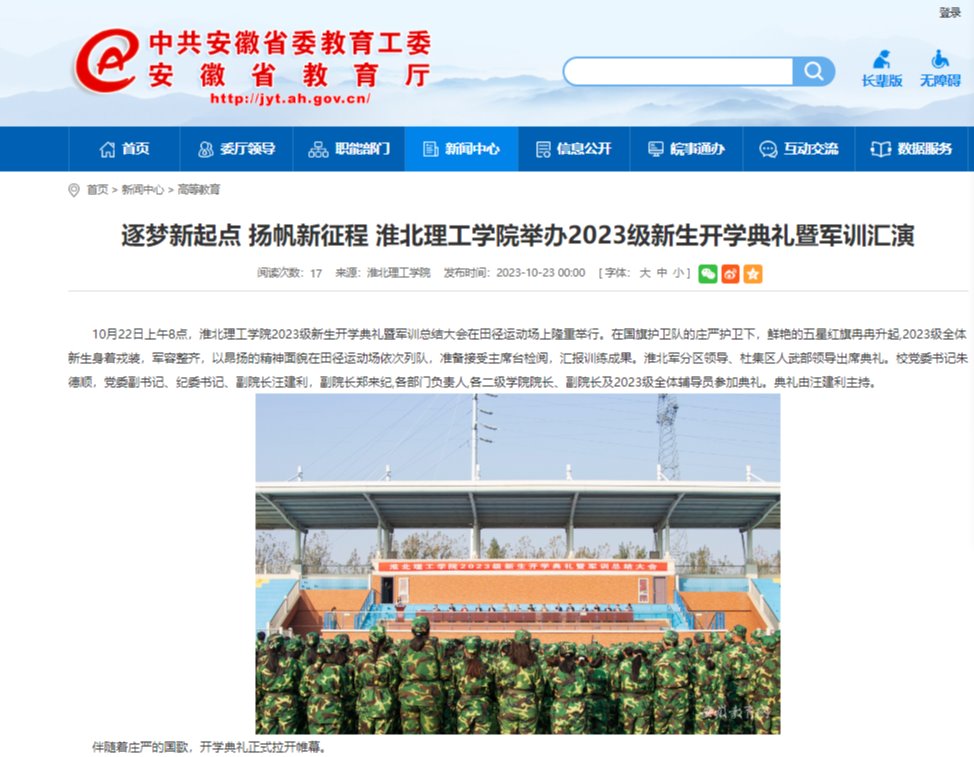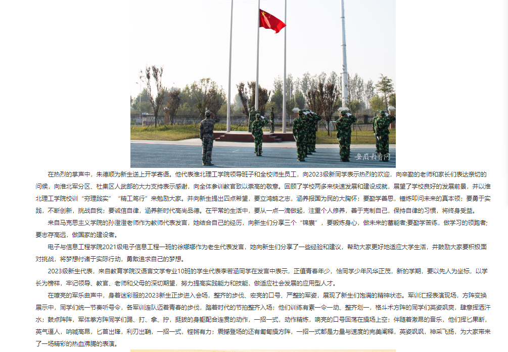 10月22日上午8点,Beat365唯一官方网站2023级新生开学典礼暨军训总结大会在田径运动场上隆重举行。在国旗护卫队的庄严护卫下,鲜艳的五星红旗冉冉升起,2023级全体新生身着戎装,军容整齐,以昂扬的精神面貌在田径运动场依次列队,准备接受主席台检阅,汇报训练成果。对此,安徽教育网进行了报道: