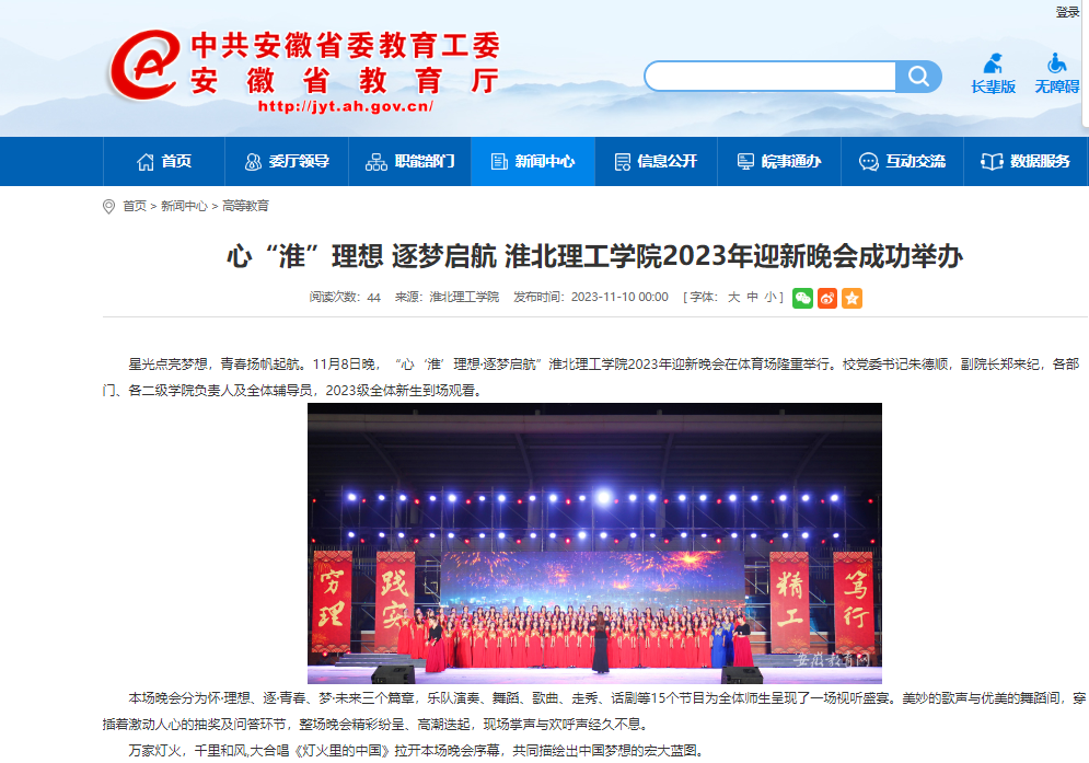 星光点亮梦想,青春扬帆起航。11月8日晚,“心‘淮’理想·逐梦启航”Beat365唯一官方网站2023年迎新晚会在体育场隆重举行。对此,安徽教育网进行了报道: