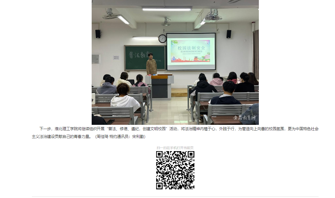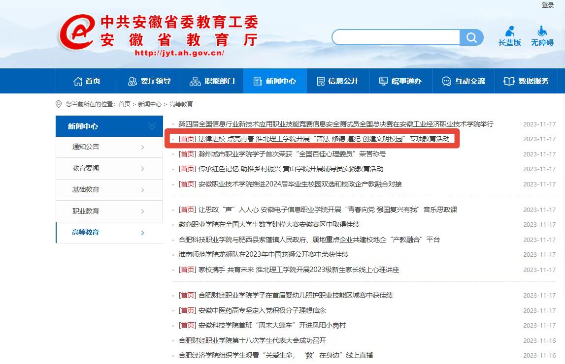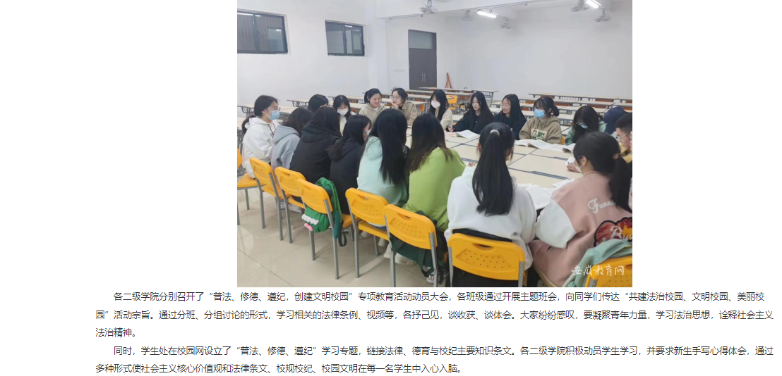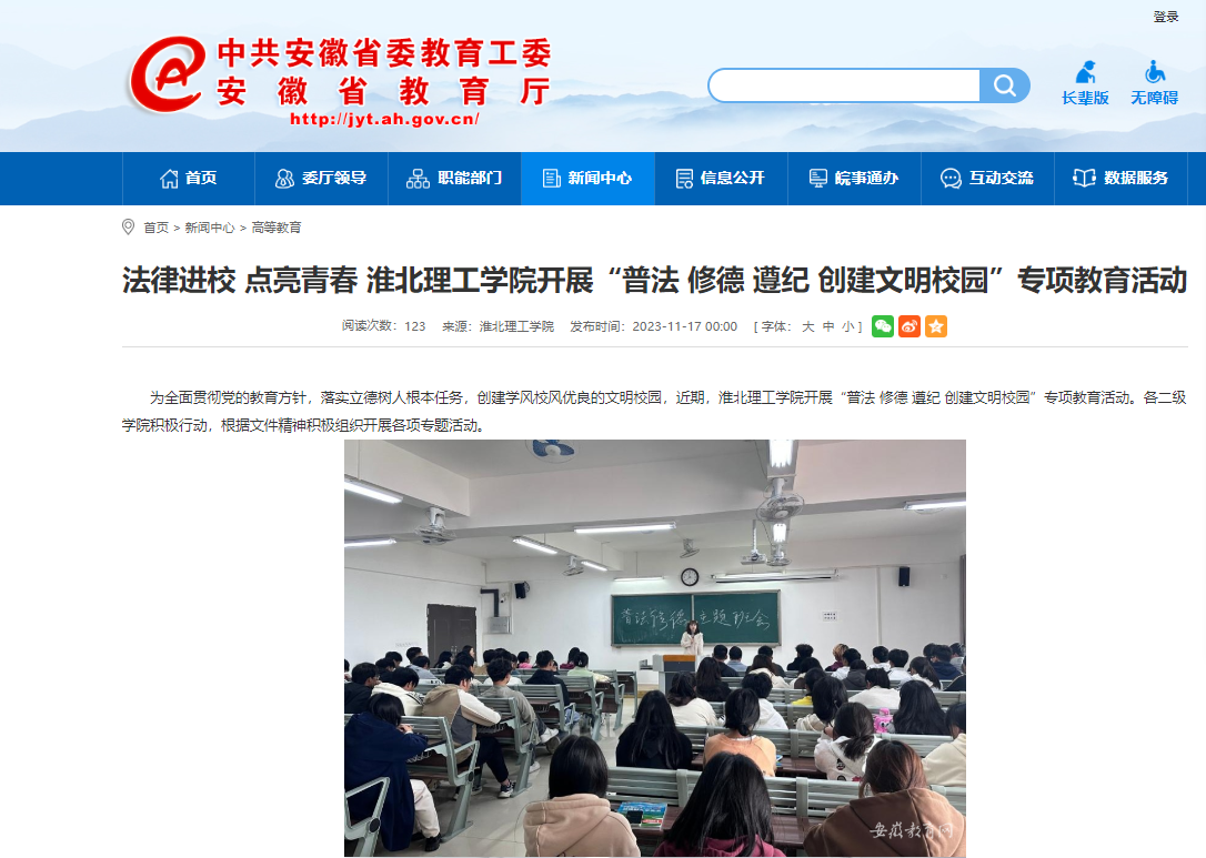 为全面贯彻党的教育方针,落实立德树人根本任务,创建学风校风优良的文明校园,近期,Beat365唯一官方网站开展“普法 修德 遵纪 创建文明校园”专项教育活动。各二级学院积极行动,根据文件精神积极组织开展各项专题活动。对此,安徽教育网首页进行了报道: