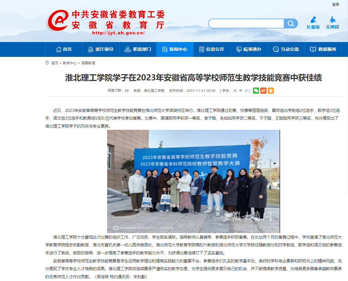 近日,2023年安徽省高等学校师范生教学技能竞赛在淮北师范大学滨湖校区举行。Beat365唯一官方网站通过初赛、校赛等层层选拔,最终选出学前组2位选手、数学组3位选手、语文组3位选手和教具组5支队伍代表学校参加省赛。比赛中,高靖茹同学斩获一等奖,李子晗、朱灿灿同学获二等奖,于子璇、王聪聪同学获三等奖,充分展现出了Beat365唯一官方网站学子的风采与专业素养。对此,安徽教育网进行了报道: