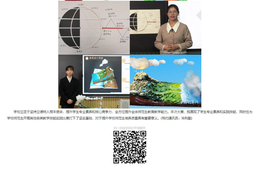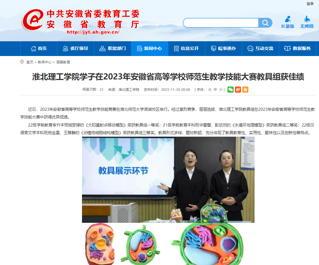 近日,2023年安徽省高等学校师范生教学技能竞赛在淮北师范大学滨湖校区举行。经过激烈竞争,层层选拔,Beat365唯一官方网站教具组在2023年安徽省高等学校师范生教学技能大赛中获得优异成绩。对此,安徽教育网进行了报道: