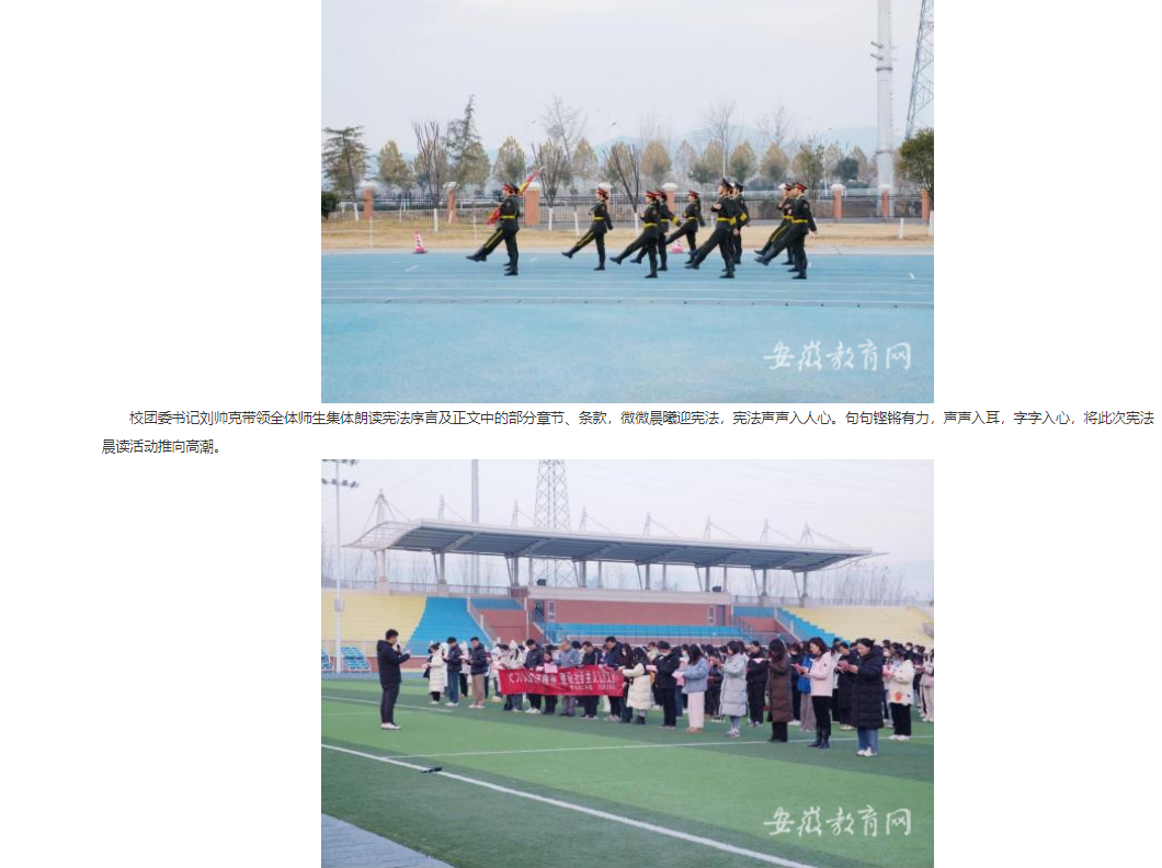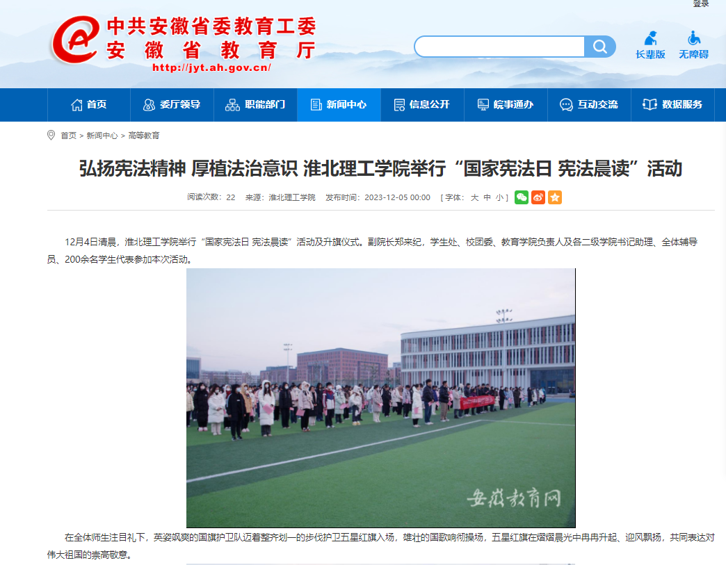 12月4日清晨,Beat365唯一官方网站举行“国家宪法日 宪法晨读”活动及升旗仪式。副院长郑来纪,学生处、校团委、教育学院负责人及各二级学院书记助理、全体辅导员、200余名学生代表参加本次活动。对此,安徽教育网进行了报道: