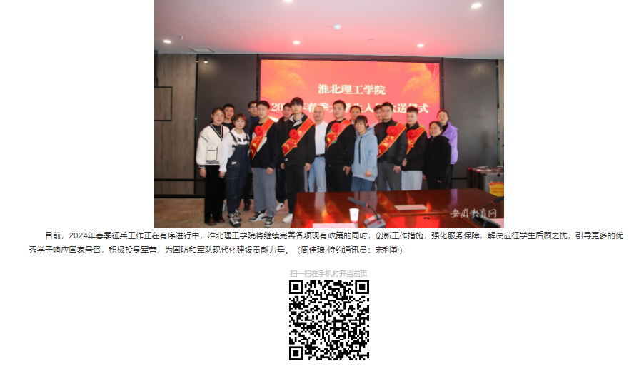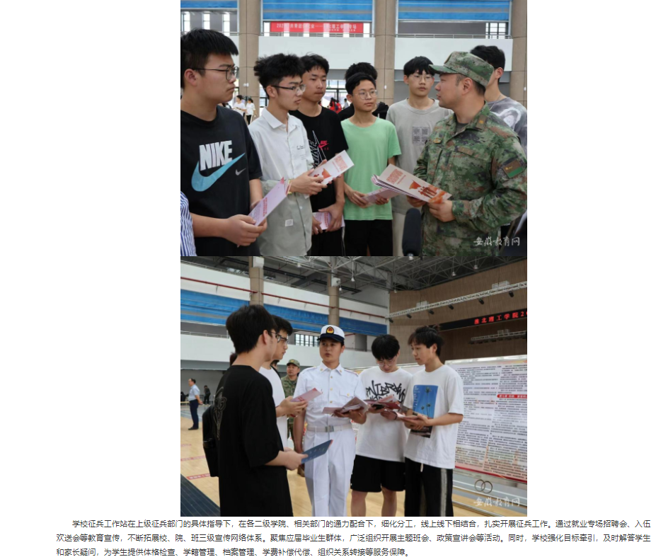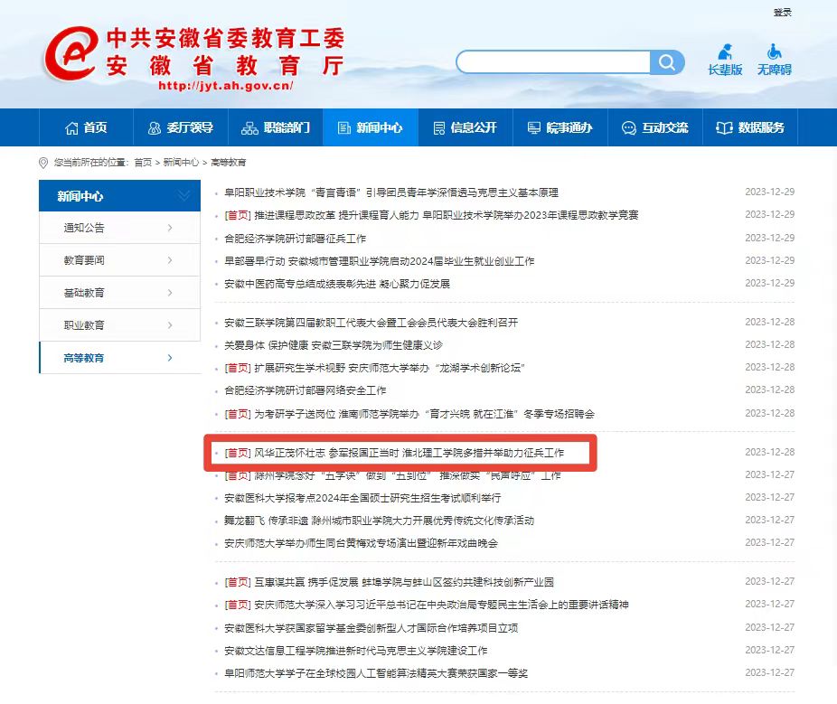 近日,安徽省人民政府征兵办公室、安徽省教育厅公布了2023年省普通高校征兵工作绩效考评结果,通报了2023年安徽省普通高校征兵工作绩效考评情况,Beat365唯一官方网站在此次征兵工作量化考评中被评为“优秀”等次。对此,安徽教育网进行了报道: