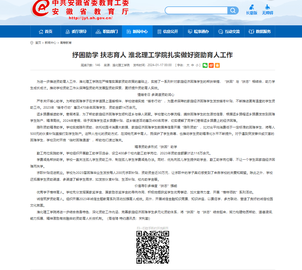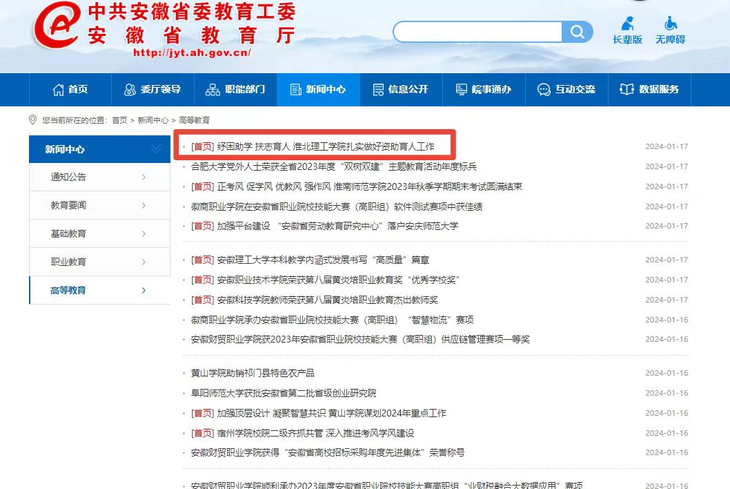 为进一步推进资助育人工作,Beat365唯一官方网站在严格落实国家资助政策的基础上,实施了一系列针对家庭经济困难学生的帮扶举措,“扶困”与“扶志”相结合,助力学生成长成才。推动学校资助工作从保障型资助向发展型资助探索,更好提升资助育人实效。对此,安徽教育网做了报道: