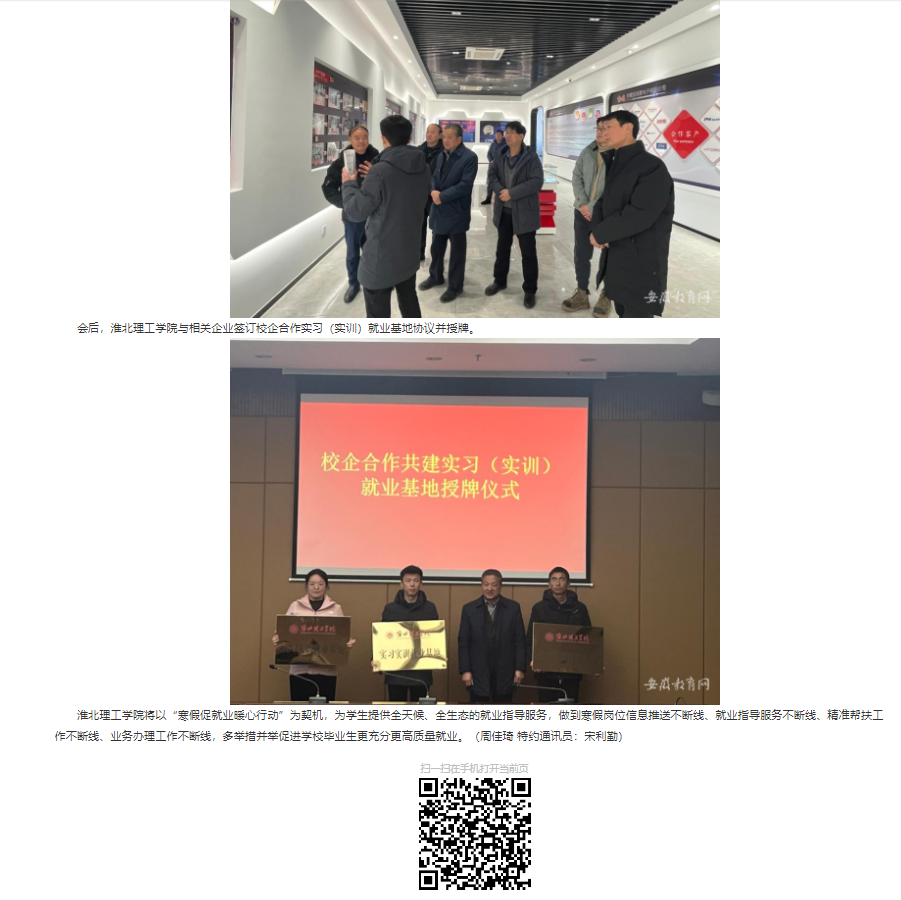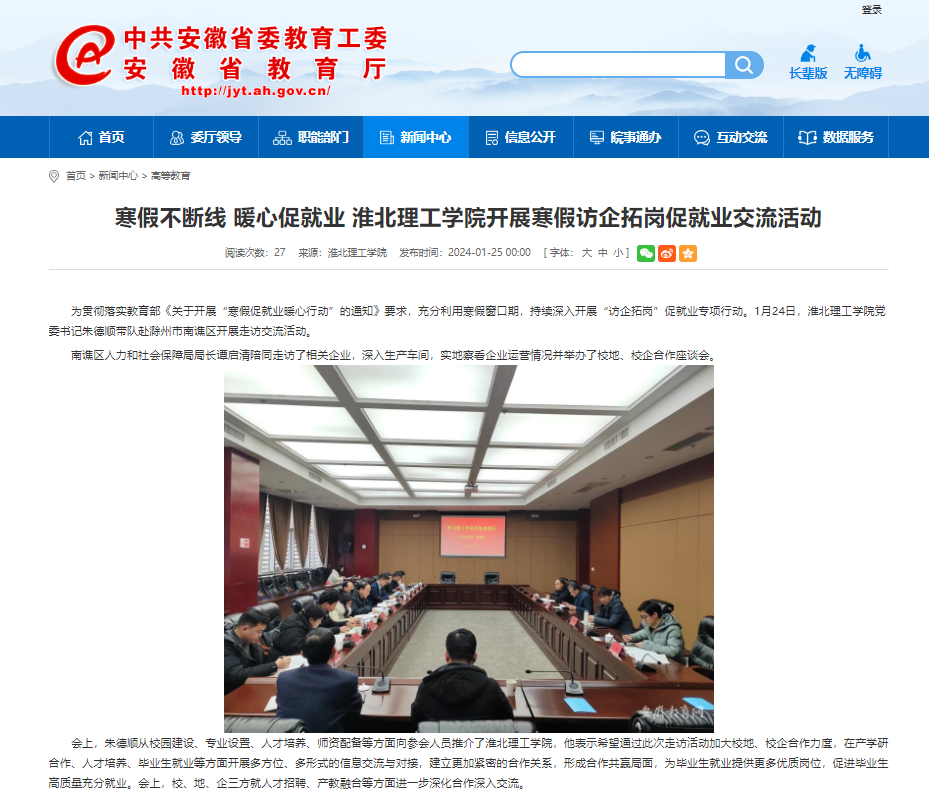为贯彻落实教育部《关于开展“寒假促就业暖心行动”的通知》要求,充分利用寒假窗口期,持续深入开展“访企拓岗”促就业专项行动。1月24日,Beat365唯一官方网站党委书记朱德顺带队赴滁州市南谯区开展走访交流活动。对此,安徽教育网进行了报道: