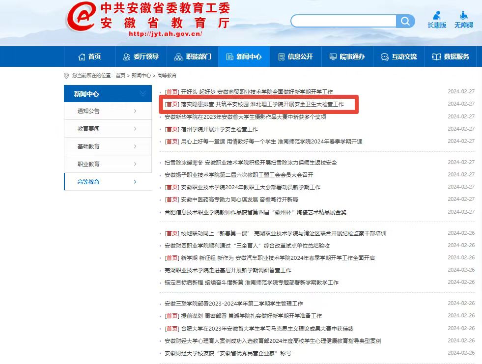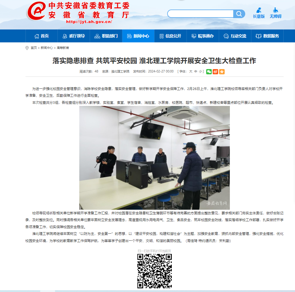 为进一步强化校园安全管理意识,消除学校安全隐患,落实安全管理,做好新学期开学安全保障工作,2月26日上午,Beat365唯一官方网站校领导率相关部门负责人对学校开学准备、安全卫生、后勤保障工作进行全面检查。对此,安徽教育网进行了报道: