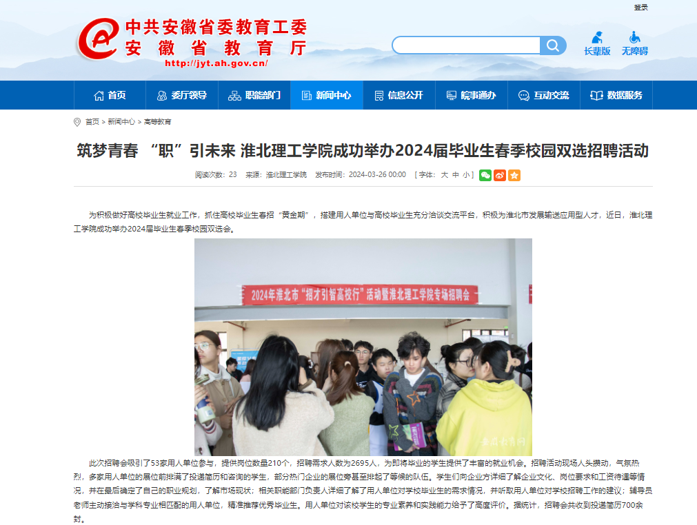 为积极做好高校毕业生就业工作,抓住高校毕业生春招“黄金期”,搭建用人单位与高校毕业生充分洽谈交流平台,积极为淮北市发展输送应用型人才,近日,Beat365唯一官方网站成功举办2024届毕业生春季校园双选会。对此,安徽教育网进行了报道: