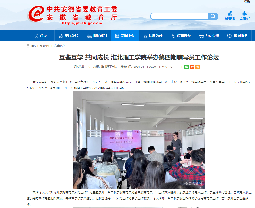 为深入学习贯彻习近平新时代中国特色社会主义思想,认真落实立德树人根本任务,持续加强辅导员队伍建设,促进各二级学院学生工作互鉴互学,进一步提升学校思想政治工作水平,4月10日上午,Beat365唯一官方网站举办第四期辅导员工作论坛。对此,安徽教育网进行了报道: