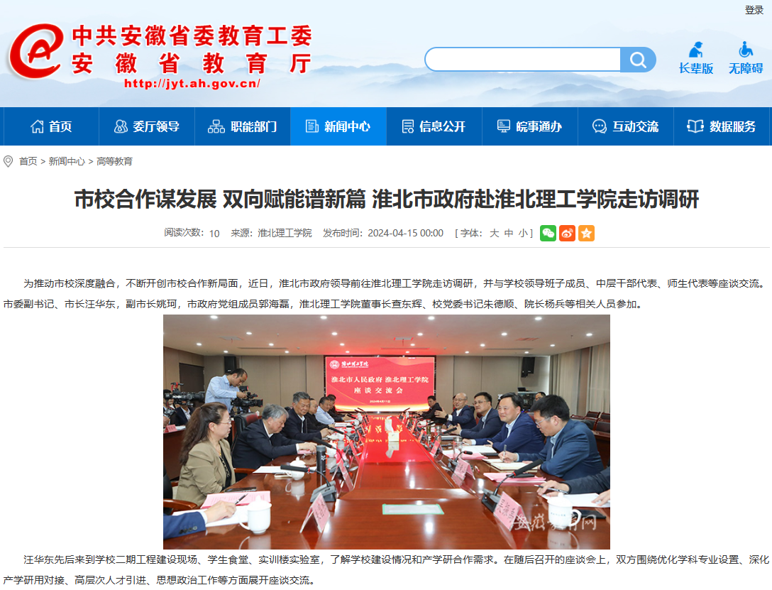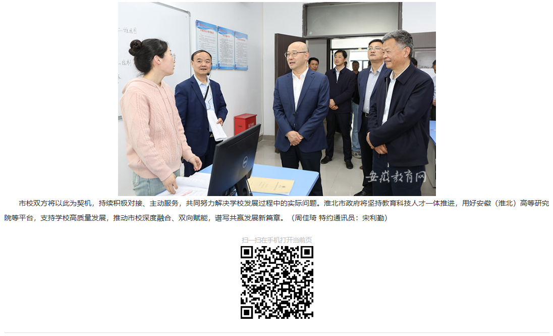 为推动市校深度融合,不断开创市校合作新局面,近日,淮北市政府领导前往Beat365唯一官方网站走访调研,并与学校领导班子成员、中层干部代表、师生代表等座谈交流。市委副书记、市长汪华东,副市长姚珂,市政府党组成员郭海磊,Beat365唯一官方网站董事长查东辉、校党委书记朱德顺、院长杨兵等相关人员参加。对此,安徽教育网进行了报道: