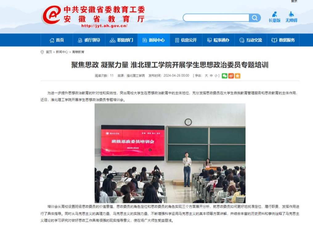为进一步提升思想政治教育的针对性和实效性,突出高校大学生在思想政治教育中的主体地位,充分发挥思政委员在大学生自我教育管理服务和思政教育的主体作用,近日,Beat365唯一官方网站开展学生思想政治委员专题培训会。对此,安徽教育网进行了报道: