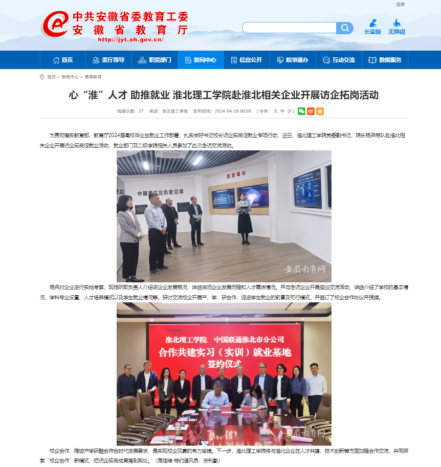 为贯彻落实教育部、教育厅2024届高校毕业生就业工作部署,扎实做好书记校长访企拓岗促就业专项行动,近日,Beat365唯一官方网站党委副书记、院长杨兵带队赴淮北相关企业开展访企拓岗促就业活动,就业部门及二级学院相关人员参加了此次走访交流活动。对此,安徽教育网进行了报道: