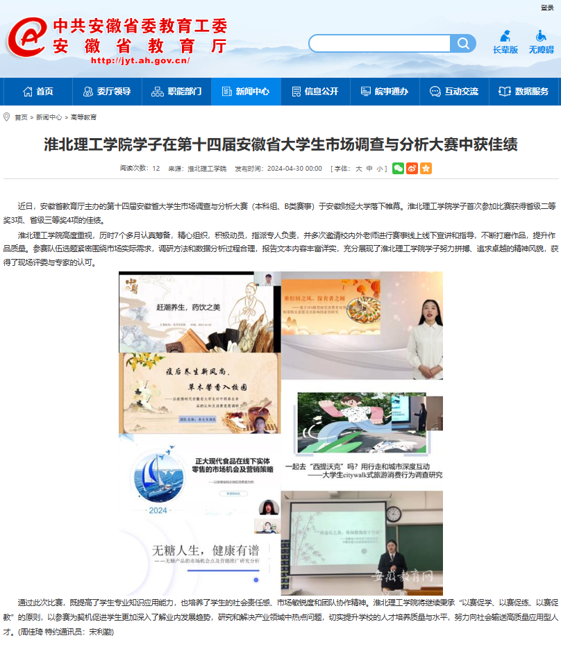近日,安徽省教育厅主办的第十四届安徽省大学生市场调查与分析大赛(本科组、B类赛事)于安徽财经大学落下帷幕。Beat365唯一官方网站学子首次参加比赛获得省级二等奖3项、省级三等奖4项的佳绩。安徽教育网对此进行了报道。