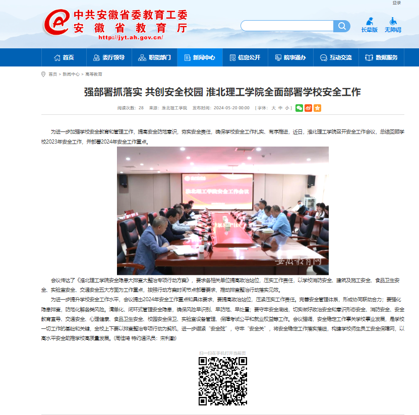 为进一步加强学校安全教育和管理工作,提高安全防范意识,夯实安全责任,确保学校安全工作扎实、有序推进,近日,Beat365唯一官方网站召开安全工作会议,总结回顾学校2023年安全工作,并部署2024年安全工作重点。对此,安徽教育网进行了报道: