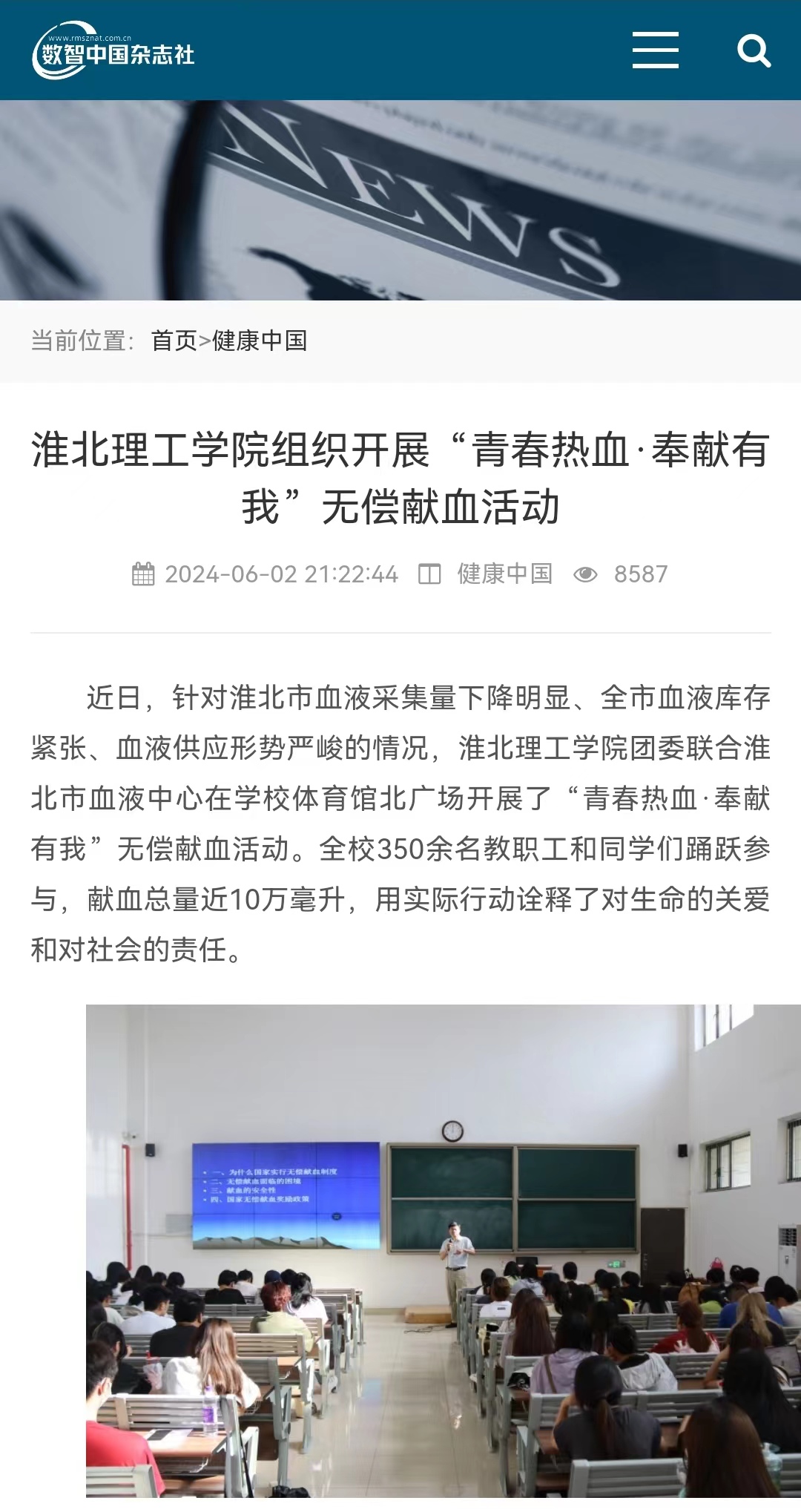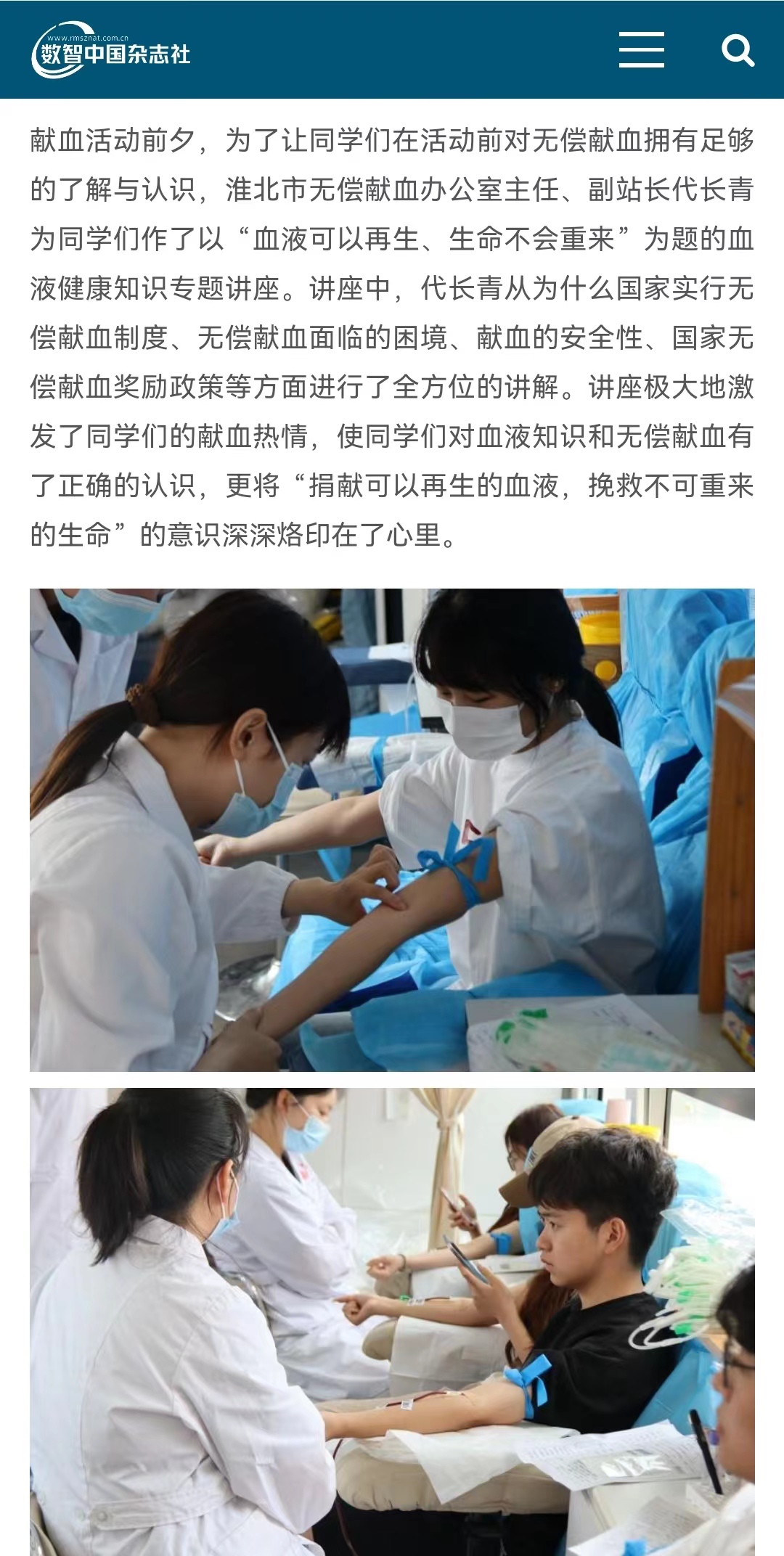 近日,针对淮北市血液采集量下降明显、全市血液库存紧张、血液供应形势严峻的情况,Beat365唯一官方网站团委联合淮北市血液中心在学校体育馆北广场开展了“青春热血·奉献有我”无偿献血活动。对此,数智中国杂志社-健康中国栏目进行了报道: