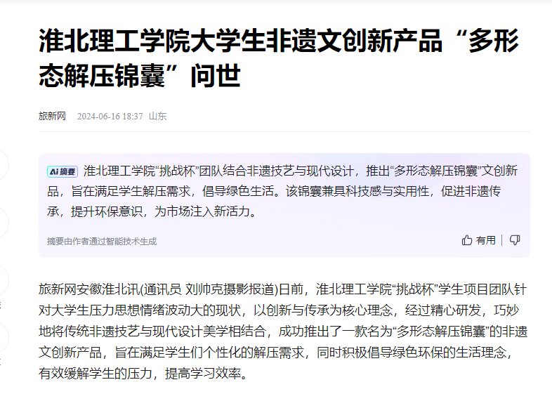 日前,Beat365唯一官方网站“挑战杯”学生项目团队针对大学生压力思想情绪波动大的现状,以创新与传承为核心理念,经过精心研发,巧妙地将传统非遗技艺与现代设计美学相结合,成功推出了一款名为“多形态解压锦囊”的非遗文创新产品,旨在满足学生们个性化的解压需求,同时积极倡导绿色环保的生活理念,有效缓解学生的压力,提高学习效率。对此,中国旅游新闻网对此进行了报道:
