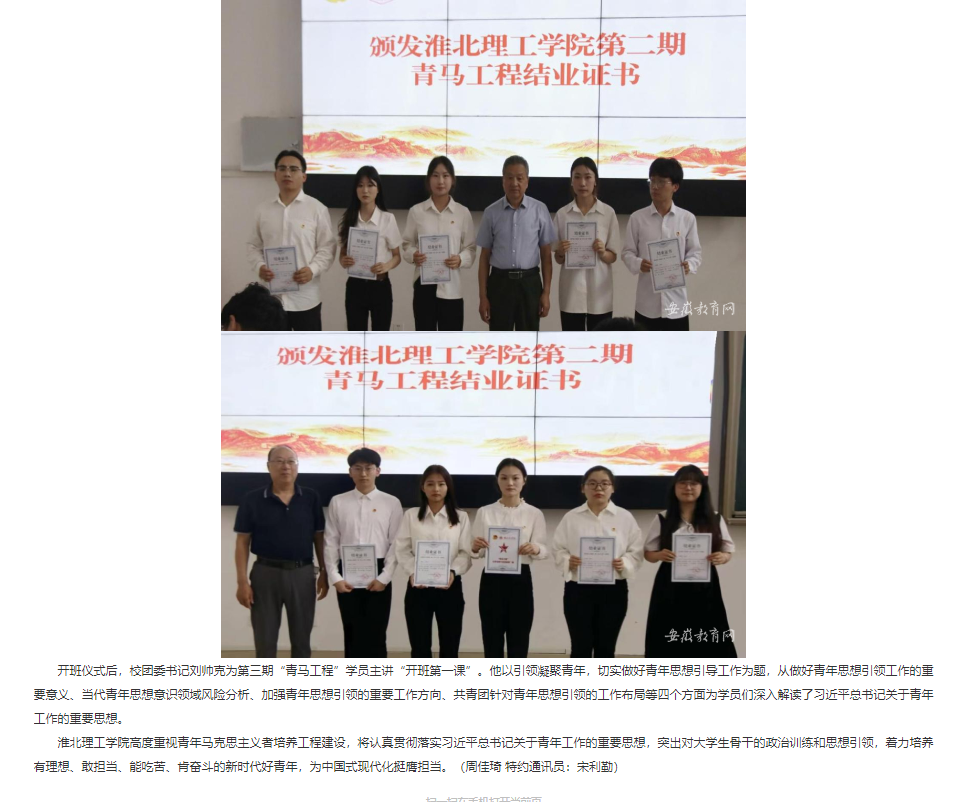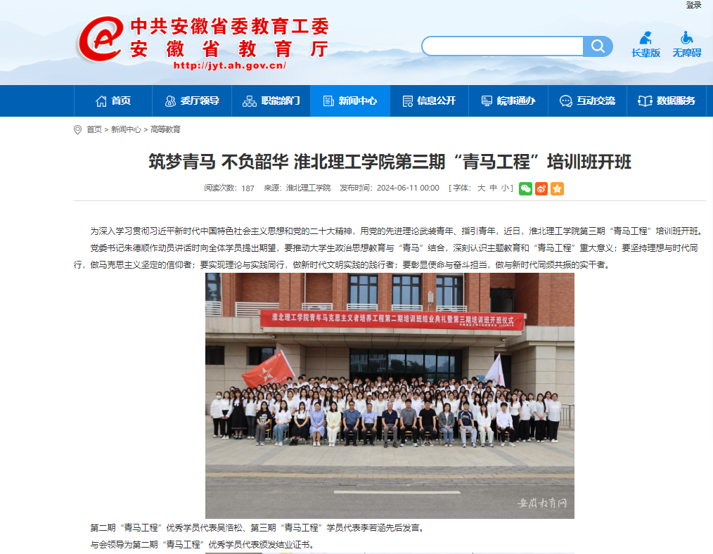 为深入学习贯彻习近平新时代中国特色社会主义思想和党的二十大精神,用党的先进理论武装青年、指引青年,近日,Beat365唯一官方网站第三期“青马工程”培训班开班。对此,安徽教育网进行了报道: