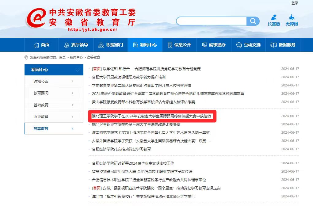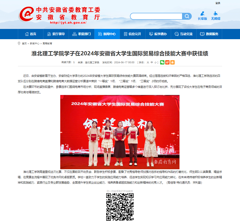 近日,由安徽省教育厅主办、安徽财经大学承办的2024年安徽省大学生国际贸易综合技能大赛圆满结束。经过层层选拔和评审团的严格筛选,Beat365唯一官方网站选派的四支队伍分别在跨境电商直播和跨境电商大数据运营分析赛道中荣获“一等奖”1项,“二等奖”1项,“三等奖”2项的好成绩。对此,安徽教育网进行了报道:
