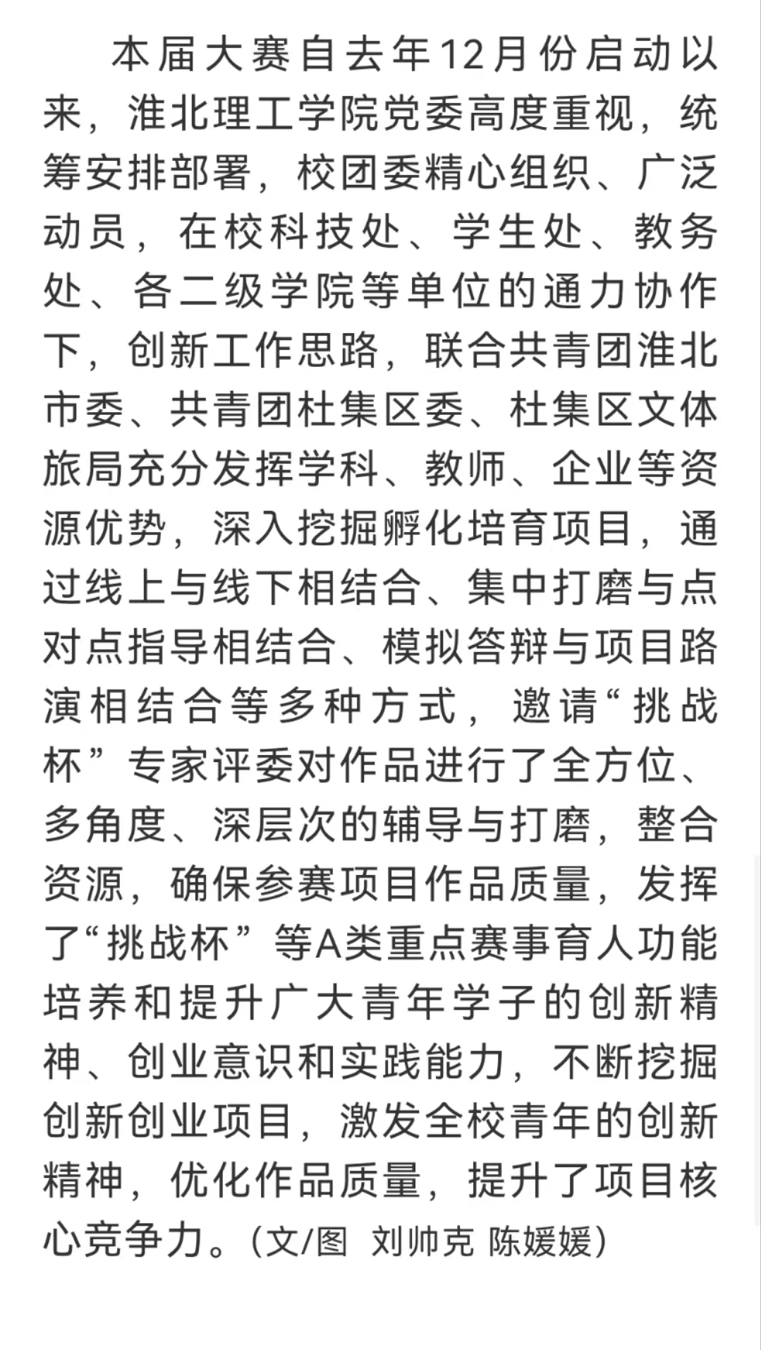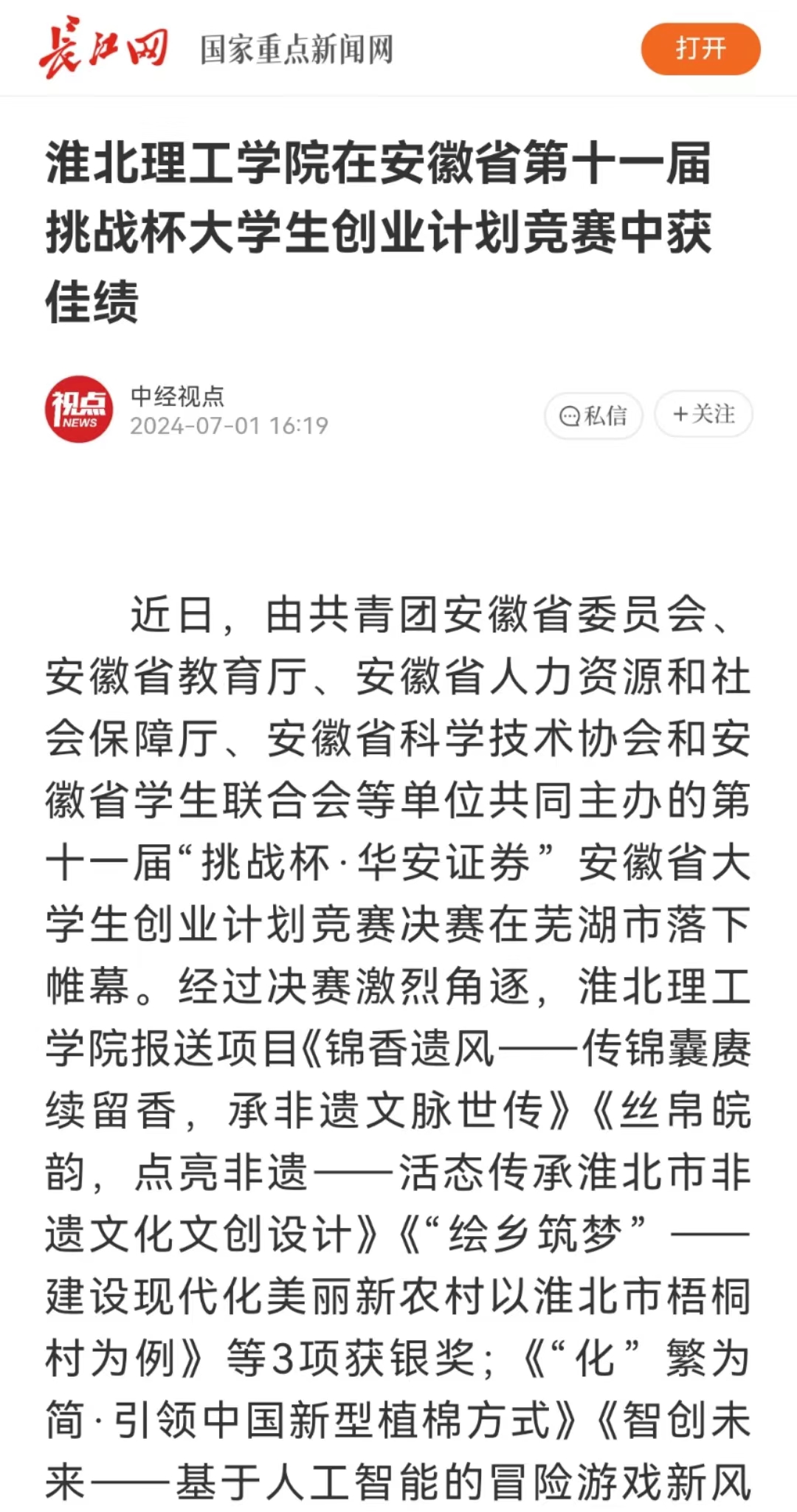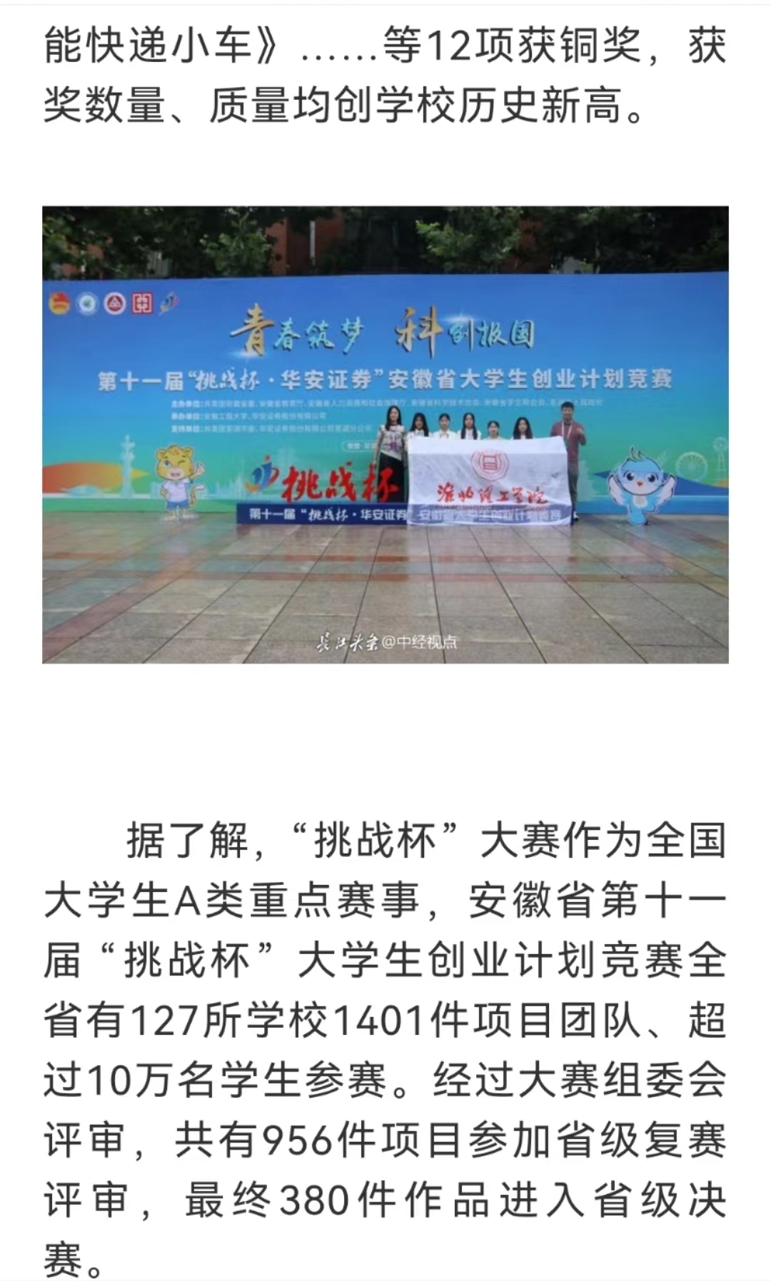 近日,由共青团安徽省委员会、安徽省教育厅、安徽省人力资源和社会保障厅、安徽省科学技术协会和安徽省学生联合会等单位共同主办的第十一届“挑战杯·华安证券”安徽省大学生创业计划竞赛决赛在芜湖市落下帷幕。经过决赛激烈角逐,Beat365唯一官方网站报送项目《锦香遗风——传锦囊赓续留香,承非遗文脉世传》《丝帛皖韵,点亮非遗——活态传承淮北市非遗文化文创设计》《“绘乡筑梦”——建设现代化美丽新农村以淮北市梧桐村为例》等3项获银奖;《“化”繁为简·引领中国新型植棉方式》《智创未来——基于人工智能的冒险游戏新风向》《校园“最后一公里”——无人智能快递小车》……等12项获铜奖,获奖数量、质量均创学校历史新高。对此,长江网进行了报道: