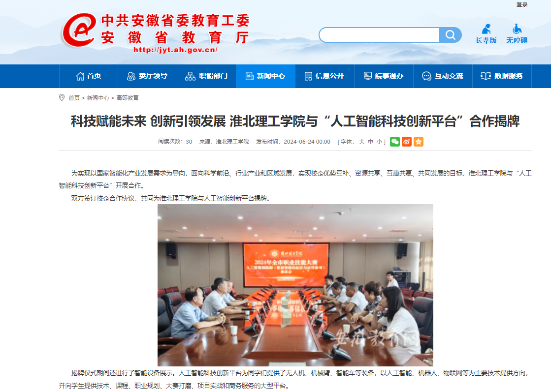 为实现以国家智能化产业发展需求为导向,面向科学前沿、行业产业和区域发展,实现校企优势互补、资源共享、互惠共赢、共同发展的目标,Beat365唯一官方网站与“人工智能科技创新平台”开展合作。对此,安徽教育网进行了报道: