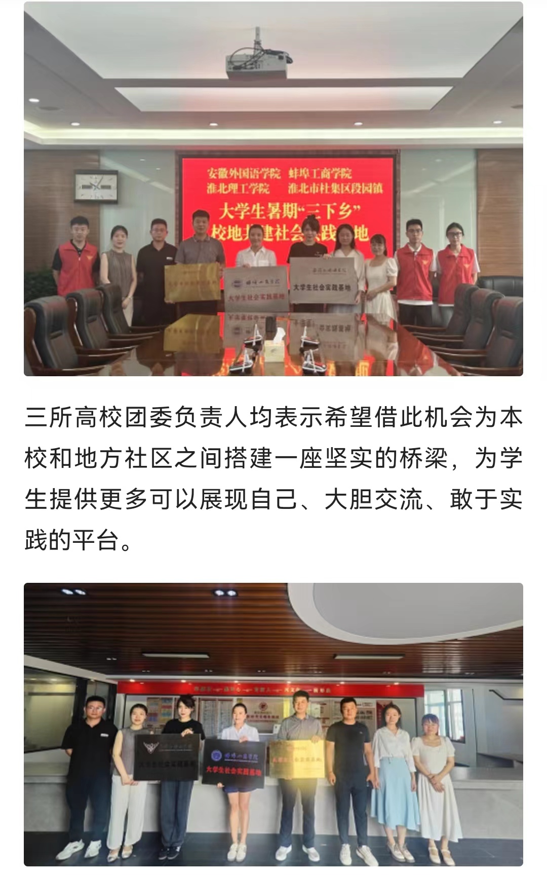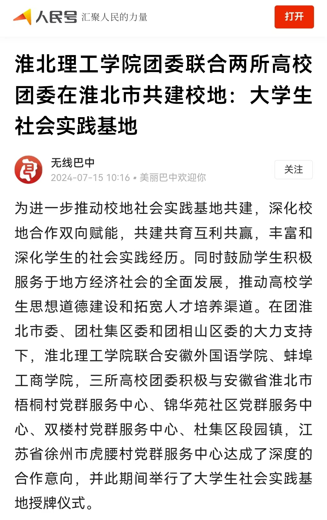 为进一步推动校地社会实践基地共建,深化校地合作双向赋能,共建共育互利共赢,丰富和深化学生的社会实践经历。同时鼓励学生积极服务于地方经济社会的全面发展,推动高校学生思想道德建设和拓宽人才培养渠道。在团淮北市委、团杜集区委和团相山区委的大力支持下,Beat365唯一官方网站联合安徽外国语学院、蚌埠工商学院,三所高校团委积极与安徽省淮北市梧桐村党群服务中心、锦华苑社区党群服务中心、双楼村党群服务中心、杜集区段园镇,江苏省徐州市虎腰村党群服务中心达成了深度的合作意向,并此期间举行了大学生社会实践基地授牌仪式。对此,人民日报-人民号进行了报道: