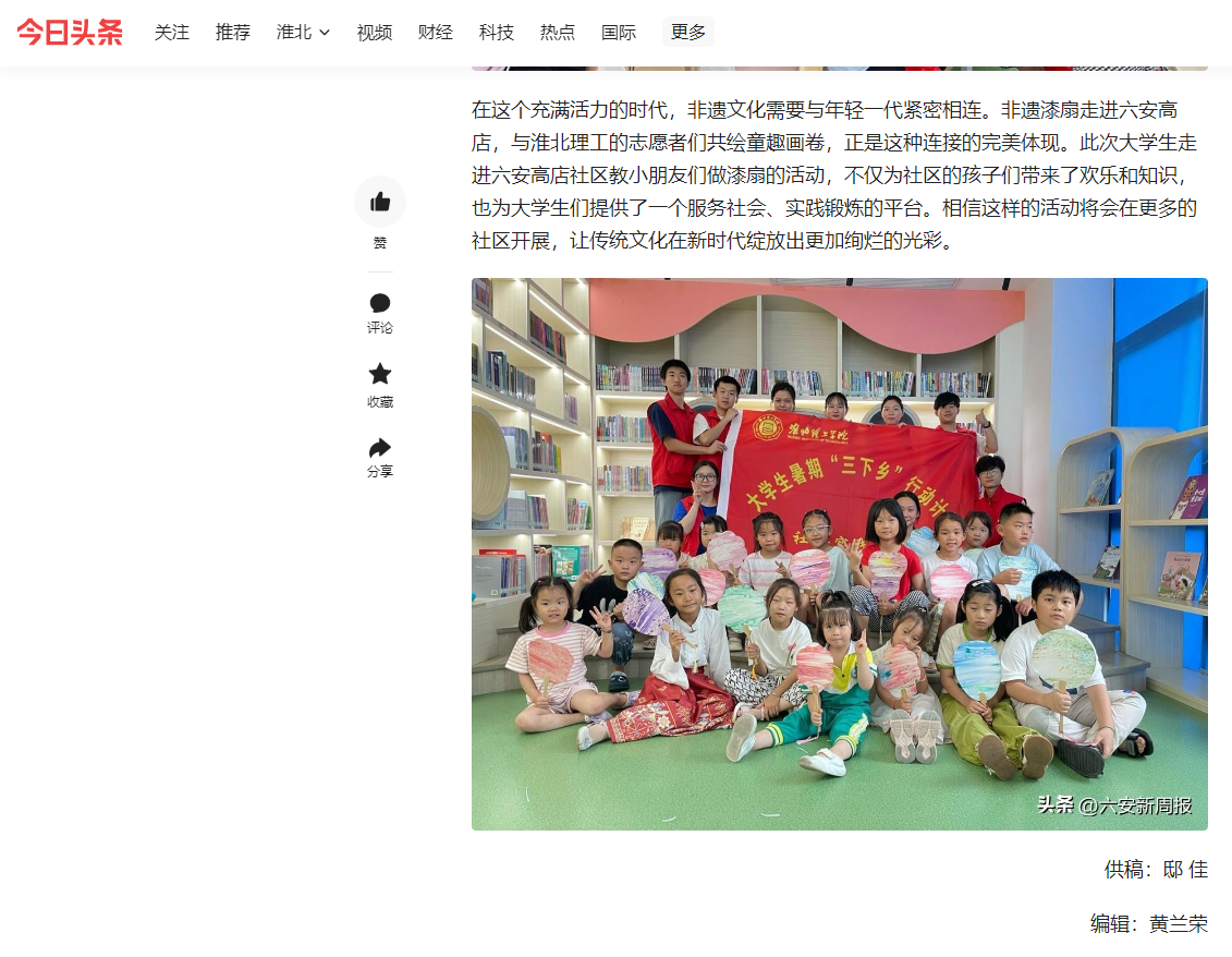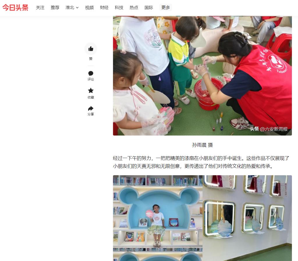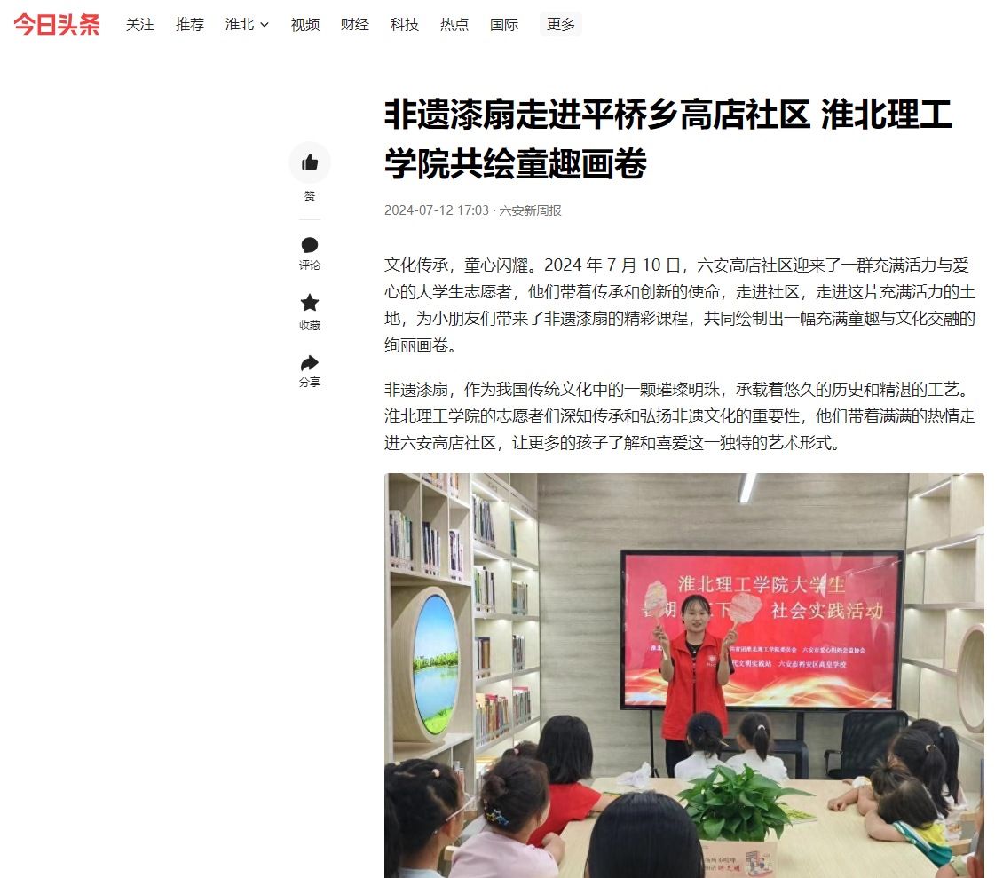 文化传承,童心闪耀。2024 年 7 月 10 日,六安高店社区迎来了一群充满活力与爱心的大学生志愿者,他们带着传承和创新的使命,走进社区,走进这片充满活力的土地,为小朋友们带来了非遗漆扇的精彩课程,共同绘制出一幅充满童趣与文化交融的绚丽画卷。对此,今日头条进行了报道: