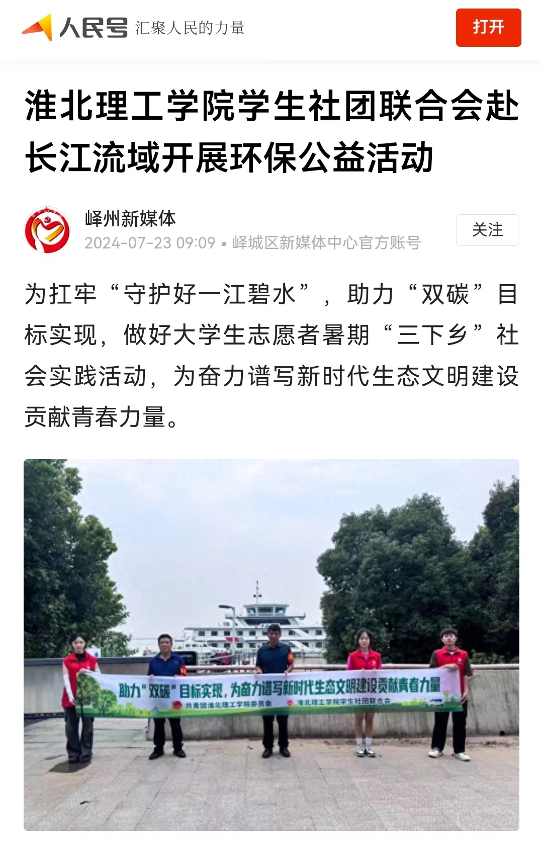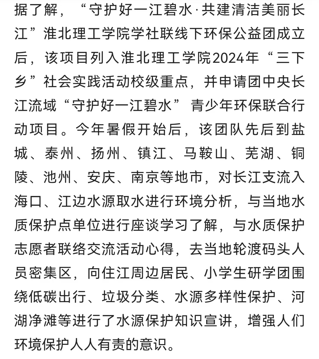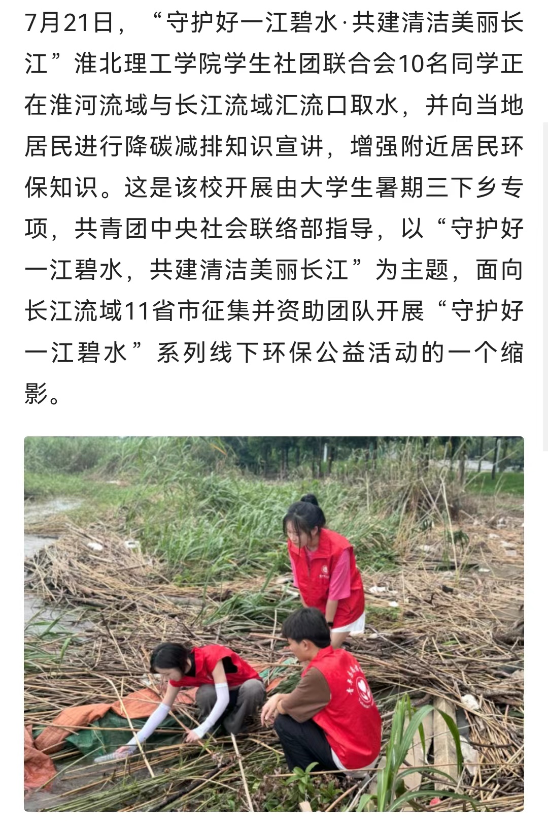 7月21日,“守护好一江碧水·共建清洁美丽长江”Beat365唯一官方网站学生社团联合会10名同学正在淮河流域与长江流域汇流口取水,并向当地居民进行降碳减排知识宣讲,增强附近居民环保知识。这是该校开展由大学生暑期三下乡专项,共青团中央社会联络部指导,以“守护好一江碧水,共建清洁美丽长江”为主题,面向长江流域11省市征集并资助团队开展“守护好一江碧水”系列线下环保公益活动的一个缩影。对此,人民日报-人民号进行报道: