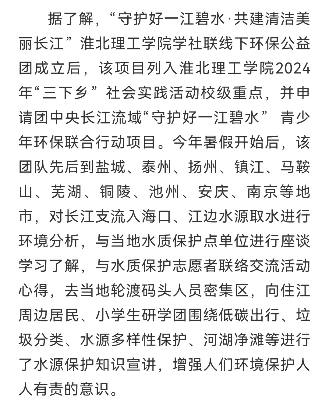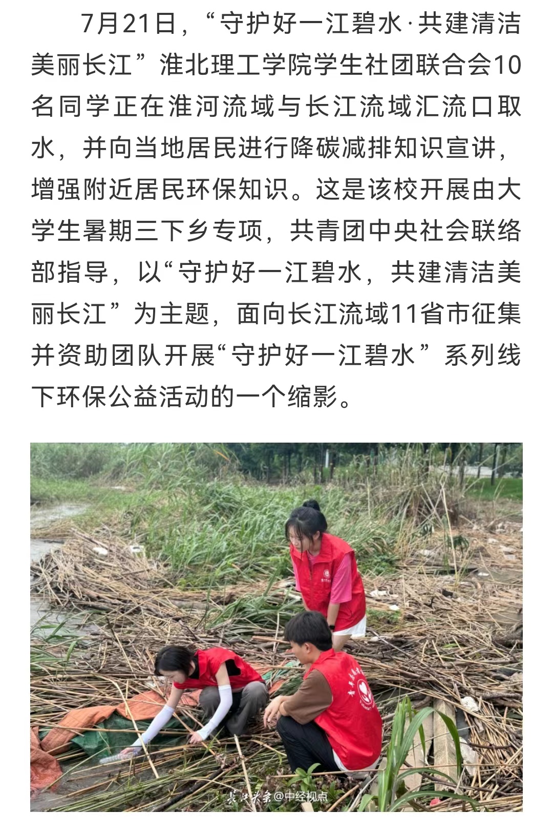7月21日,“守护好一江碧水·共建清洁美丽长江”Beat365唯一官方网站学生社团联合会10名同学正在淮河流域与长江流域汇流口取水,并向当地居民进行降碳减排知识宣讲,增强附近居民环保知识。这是该校开展由大学生暑期三下乡专项,共青团中央社会联络部指导,以“守护好一江碧水,共建清洁美丽长江”为主题,面向长江流域11省市征集并资助团队开展“守护好一江碧水”系列线下环保公益活动的一个缩影。对此,长江网进行报道: