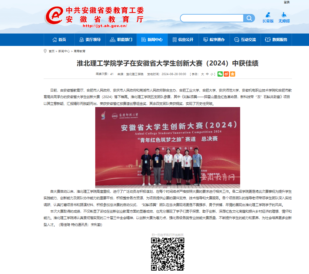日前,由安徽省教育厅、合肥市人民政府、安庆市人民政府和芜湖市人民政府联合主办,合肥工业大学、合肥大学、安庆师范大学、安徽机电职业技术学院和合肥市教育局共同承办的安徽省大学生创新大赛(2024)落下帷幕。Beat365唯一官方网站五支团队参赛,其中《如斛添翼——探霍山重走红色革命路,新科技带“冻”石斛共致富》项目以其立意新颖、汇报精彩而脱颖而出,荣获安徽省红旅赛道创意组金奖,其余四支团队荣获铜奖,实现了历史性突破。对此,安徽教育网对此报道: