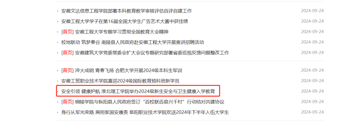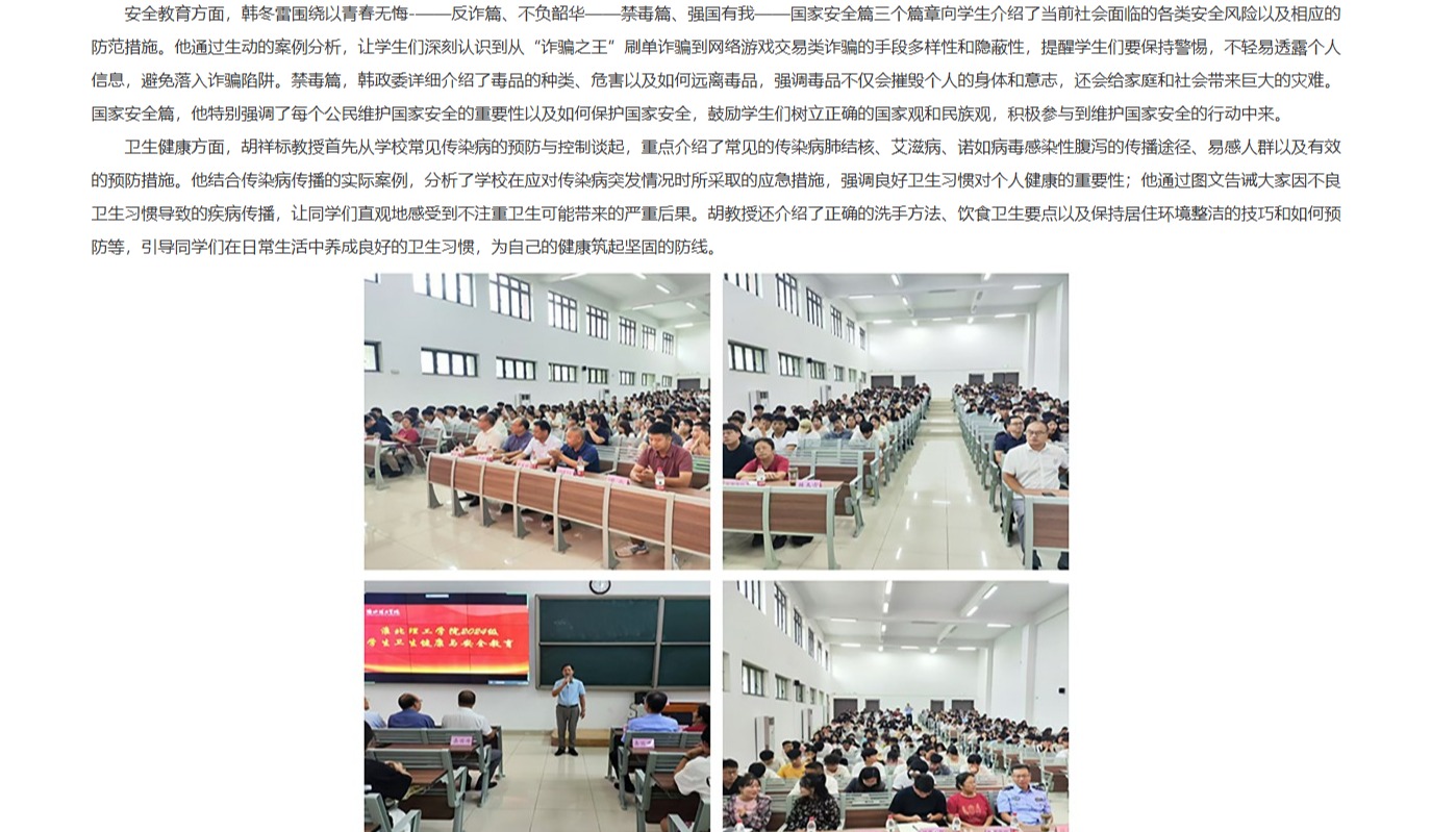 2024 年 9 月 18 日下午,Beat365唯一官方网站特邀淮北市公安局杜集分局政委韩冬雷、淮北市卫生健康委公共卫生首席专家胡祥标教授来校为2024级新生开展安全与卫生健康教育,副院长郑来纪、相关部门负责人及2024级全体新生参加活动。对此,安徽教育网进行了报道: