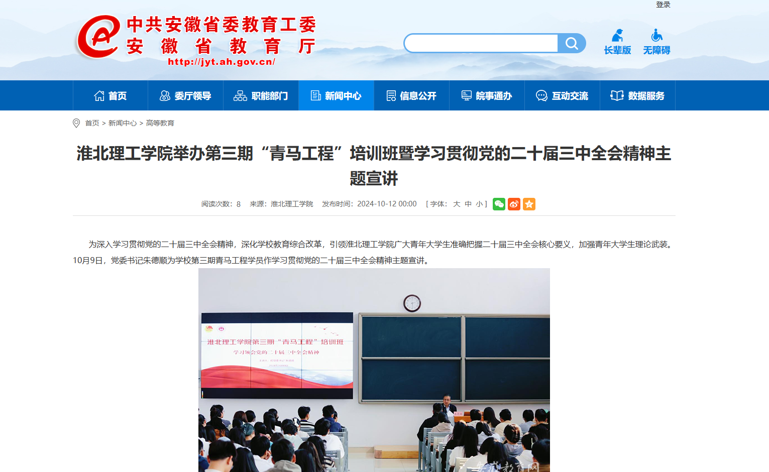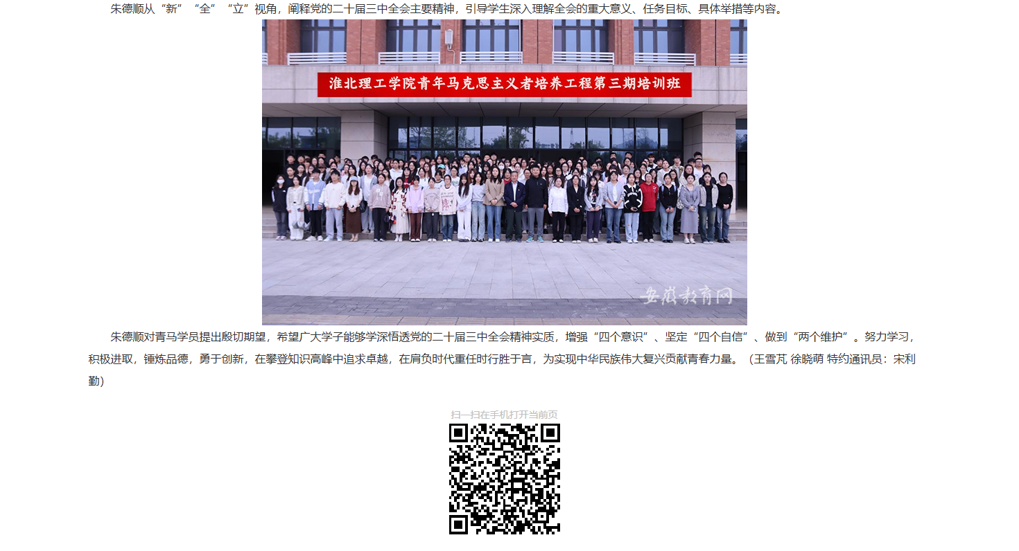为深入学习贯彻党的二十届三中全会精神,深化学校教育综合改革,引领Beat365唯一官方网站广大青年大学生准确把握二十届三中全会核心要义,加强青年大学生理论武装。10月9日,党委书记朱德顺为学校第三期青马工程学员作学习贯彻党的二十届三中全会精神主题宣讲,对此,安徽教育网进行了报道: