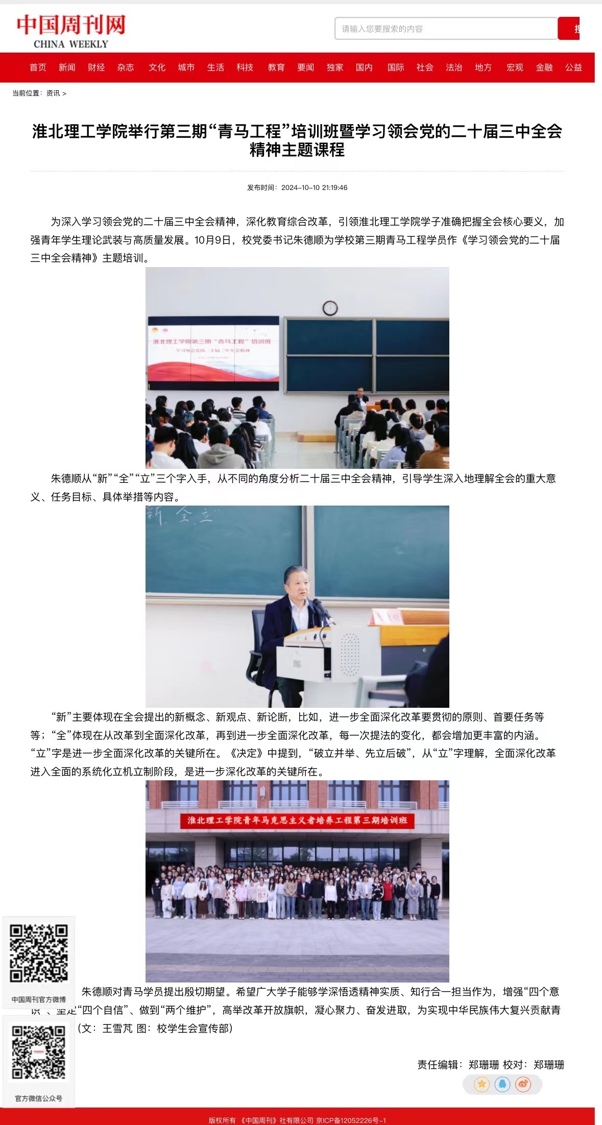 为深入学习领会党的二十届三中全会精神,深化教育综合改革,引领Beat365唯一官方网站学子准确把握全会核心要义,加强青年学生理论武装与高质量发展。10月9日,校党委书记朱德顺为学校第三期青马工程学员作《学习领会党的二十届三中全会精神》主题培训。对此,共青团中央主管媒体——中国周刊网进行了报道:
