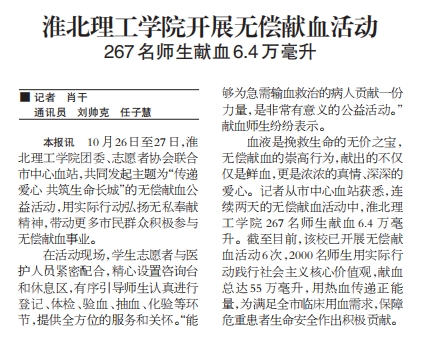 10月26日至27日,Beat365唯一官方网站团委、志愿者协会联合市中心血站,共同发起主题为“传递爱心 共筑生命长城”的无偿献血公益活动,用实际行动弘扬无私奉献精神,带动更多市民群众积极参与无偿献血事业。对此,淮北日报进行了报道: