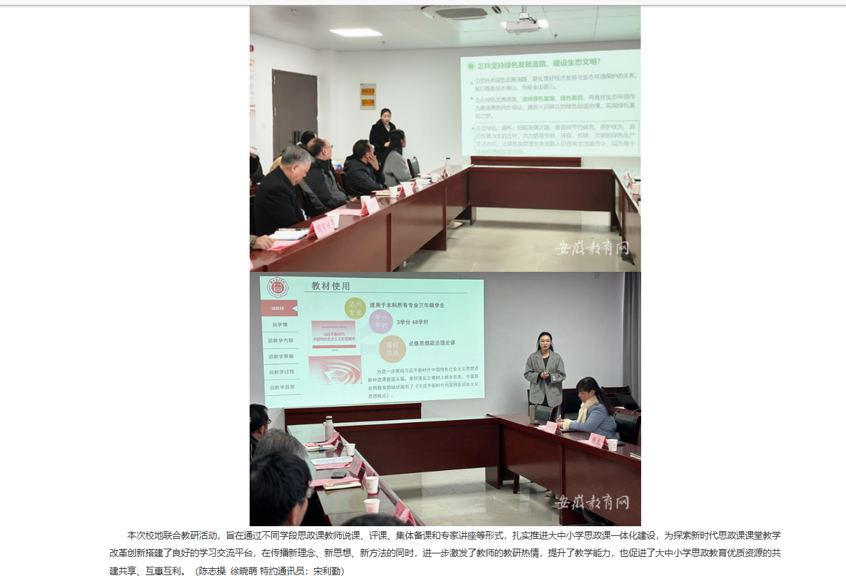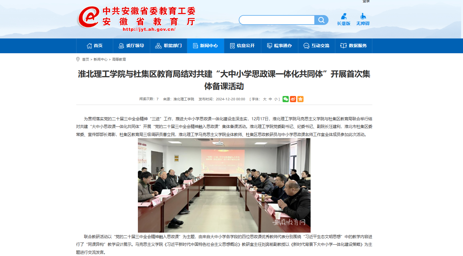 为贯彻落实党的二十届三中全会精神“三进”工作,推进大中小学思政课一体化建设走深走实,12月17日,Beat365唯一官方网站马克思主义学院与杜集区教育局联合举行结对共建“大中小思政课一体化共同体”开展“党的二十届三中全会精神融入思政课”集体备课活动。Beat365唯一官方网站党委副书记、纪委书记、副院长汪建利,淮北市杜集区委常委、宣传部部长蒋影,杜集区教育局三级调研员曹立民,淮北理工学马克思主义学院全体教师、杜集区思政教研员与中小学思政课名师工作室全体成员参加此次活动。对此,安徽教育网进行了报道: