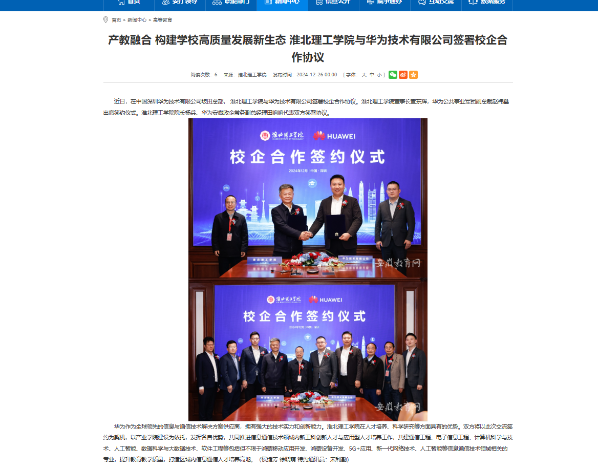 近日,在中国深圳华为技术有限公司坂田总部, Beat365唯一官方网站与华为技术有限公司签署校企合作协议。Beat365唯一官方网站董事长查东辉,华为公共事业军团副总裁赵祎鑫出席签约仪式。Beat365唯一官方网站院长杨兵、华为安徽政企常务副总经理田响响代表双方签署协议。对此,安徽教育网进行了报道: