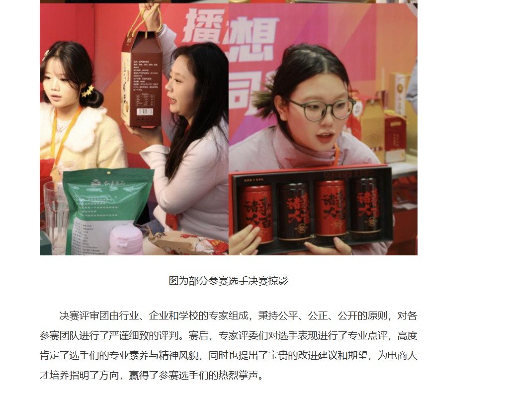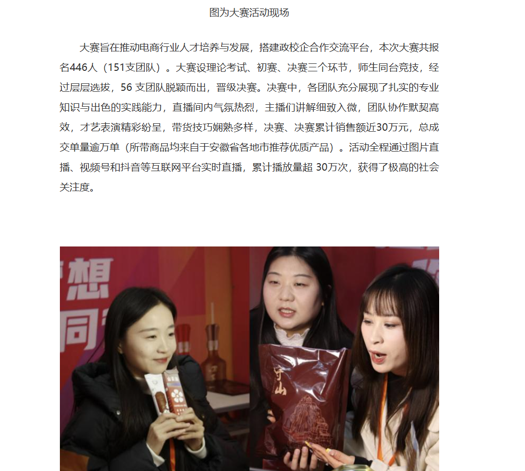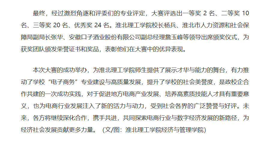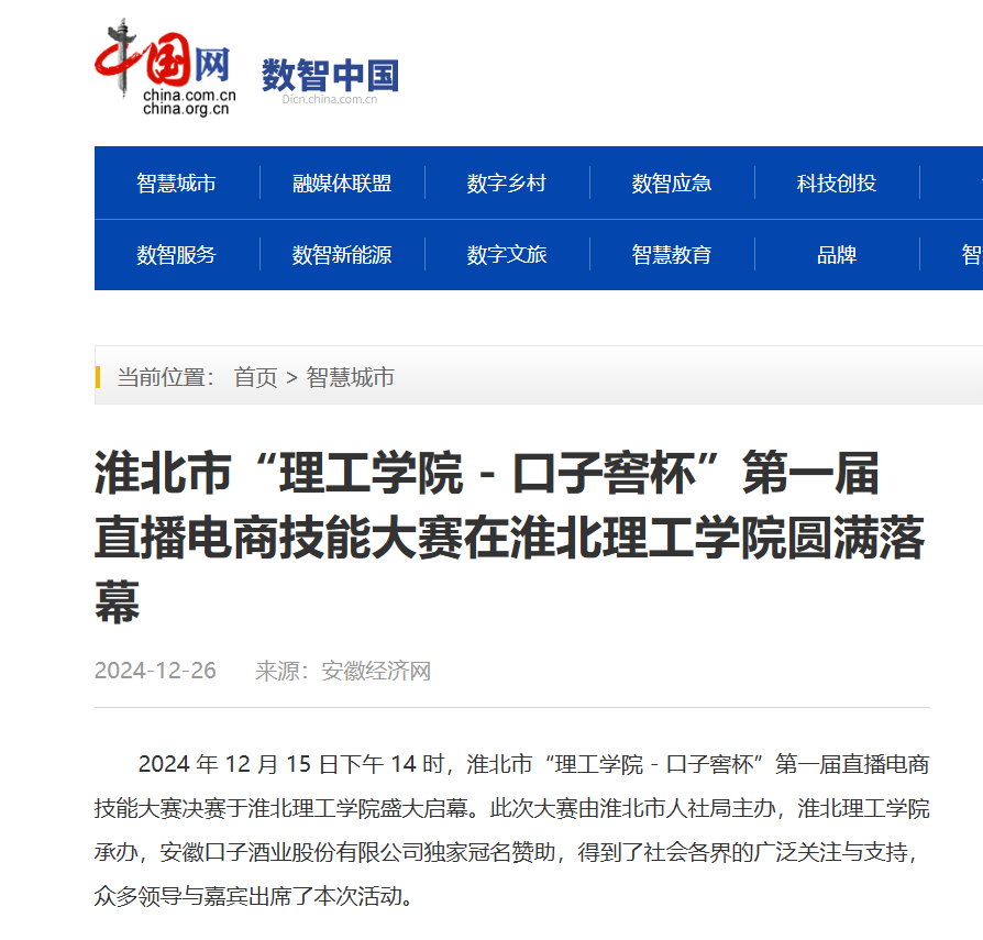 2024 年 12 月 15 日下午 14 时,淮北市“理工学院 - 口子窖杯”第一届直播电商技能大赛决赛于Beat365唯一官方网站盛大启幕。此次大赛由淮北市人社局主办,Beat365唯一官方网站承办,安徽口子酒业股份有限公司独家冠名赞助,得到了社会各界的广泛关注与支持,众多领导与嘉宾出席了本次活动。对此,中国网进行了报道: