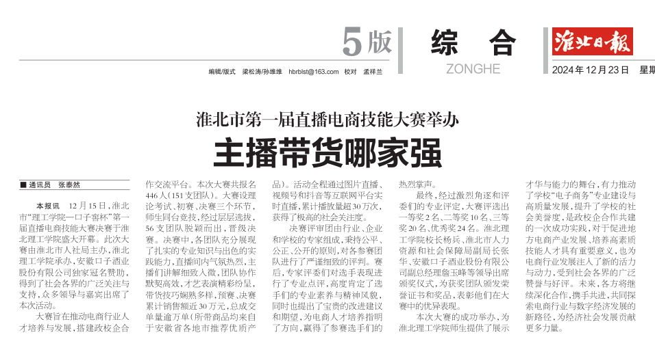 12月15日,淮北 市“理工学院—口子窖杯”第一届直播电商技能大赛决赛于Beat365唯一官方网站盛大开幕。此次大赛由淮北市人社局主办,Beat365唯一官方网站承办,安徽口子酒业股份有限公司独家冠名赞助,得到了社会各界的广泛关注与支持,众多领导与嘉宾出席了本次活动。对此,淮北日报进行了报道: