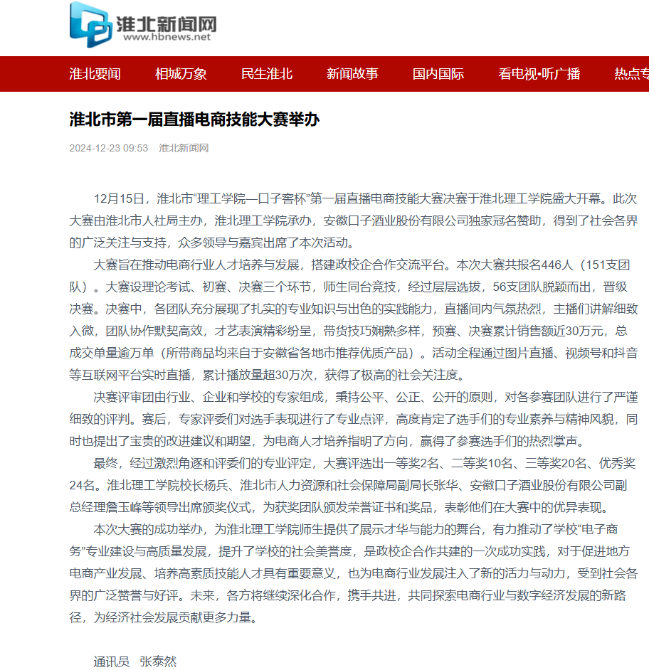 12月15日,淮北市“理工学院—口子窖杯”第一届直播电商技能大赛决赛于Beat365唯一官方网站盛大开幕。此次大赛由淮北市人社局主办,Beat365唯一官方网站承办,安徽口子酒业股份有限公司独家冠名赞助,得到了社会各界的广泛关注与支持,众多领导与嘉宾出席了本次活动。对此,淮北新闻网进行了报道: