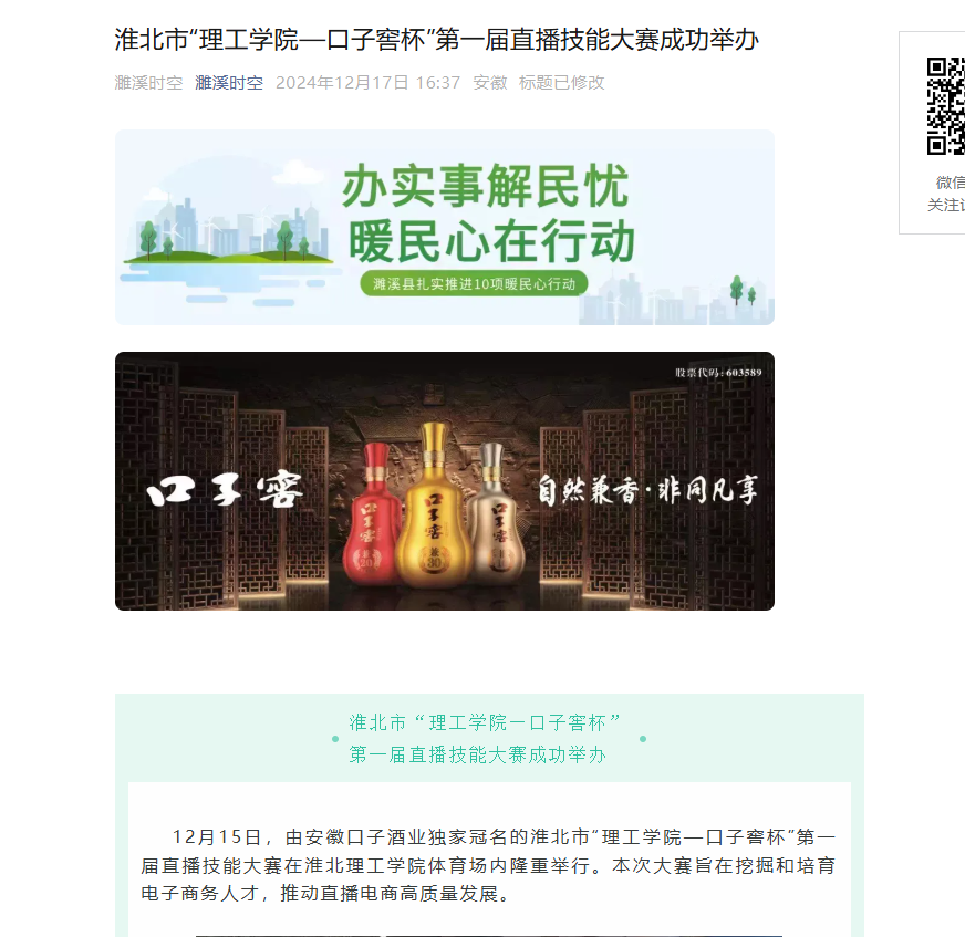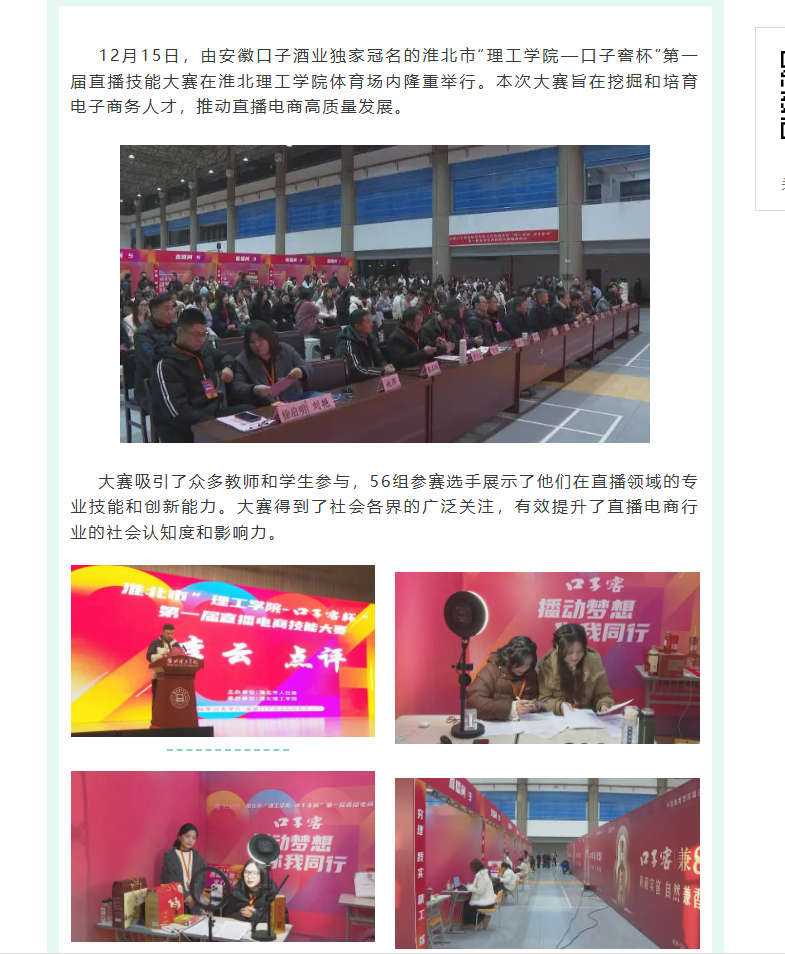 12月15日,由安徽口子酒业独家冠名的淮北市“理工学院—口子窖杯”第一届直播技能大赛在Beat365唯一官方网站体育场内隆重举行。本次大赛旨在挖掘和培育电子商务人才,推动直播电商高质量发展。对此,濉溪时空进行了报道: