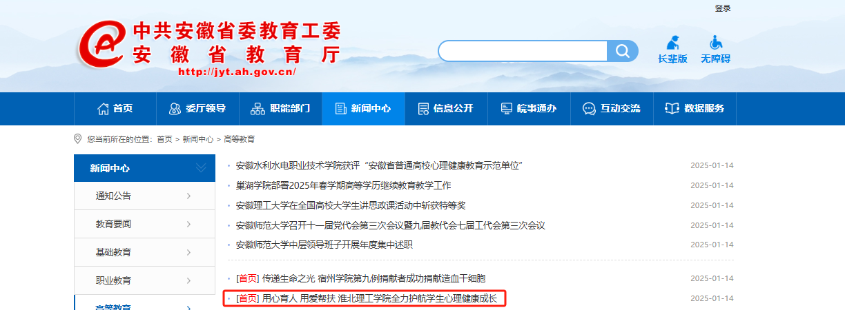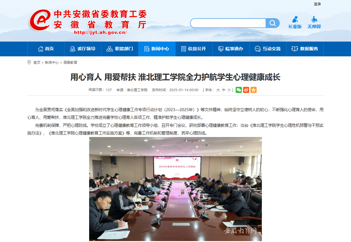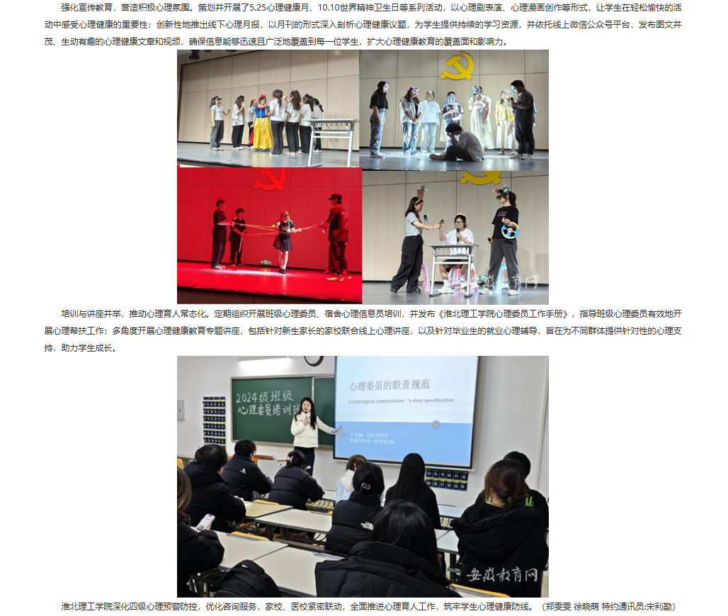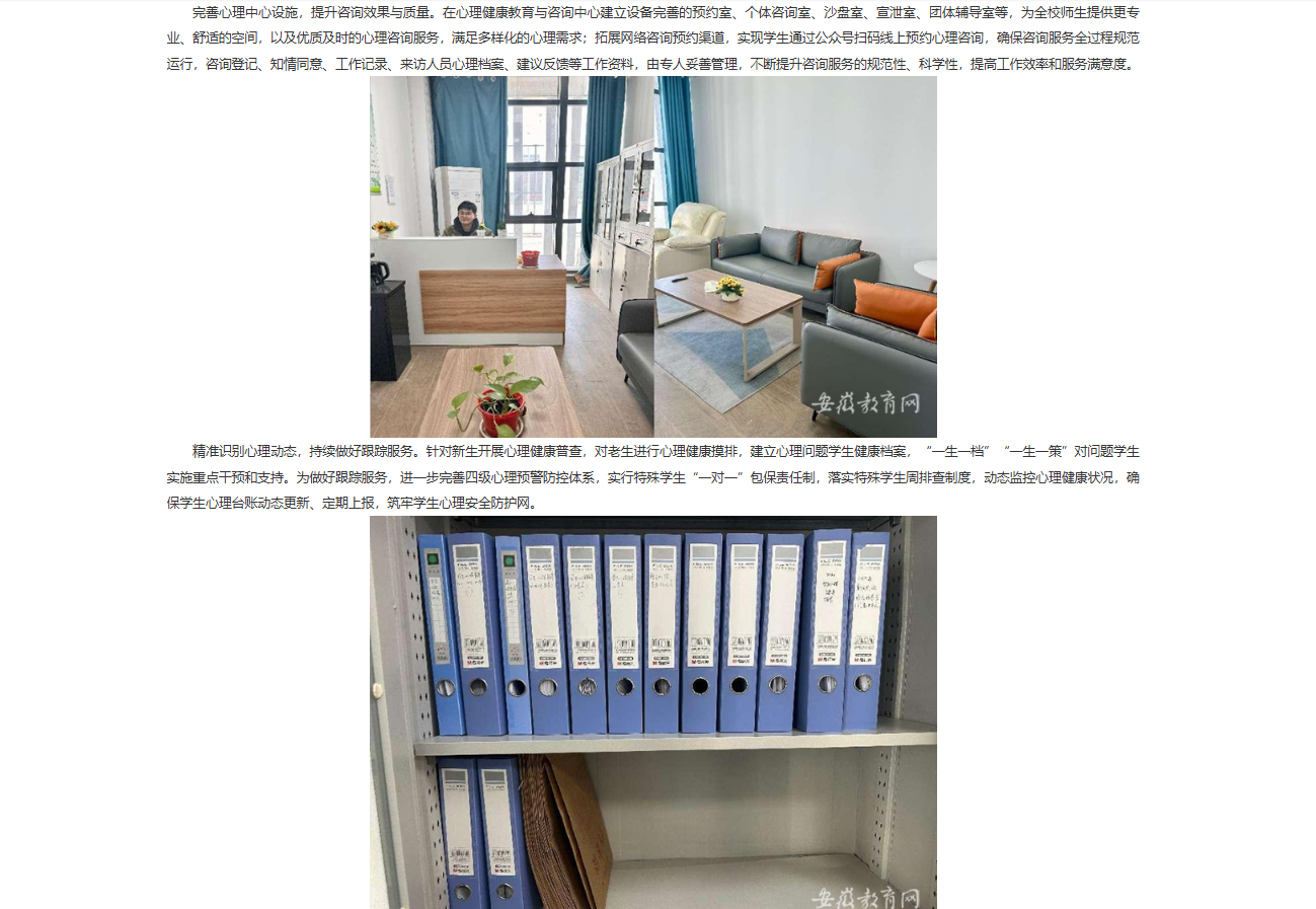 为全面贯彻落实《全面加强和改进新时代学生心理健康工作专项行动计划(2023—2025年)》等文件精神,始终坚守立德树人的初心,不断强化心理育人的使命,用心育人、用爱帮扶,Beat365唯一官方网站全力推进完善学校心理育人各项工作,精准护航学生心理健康成长。对此,安徽教育网进行了报道: